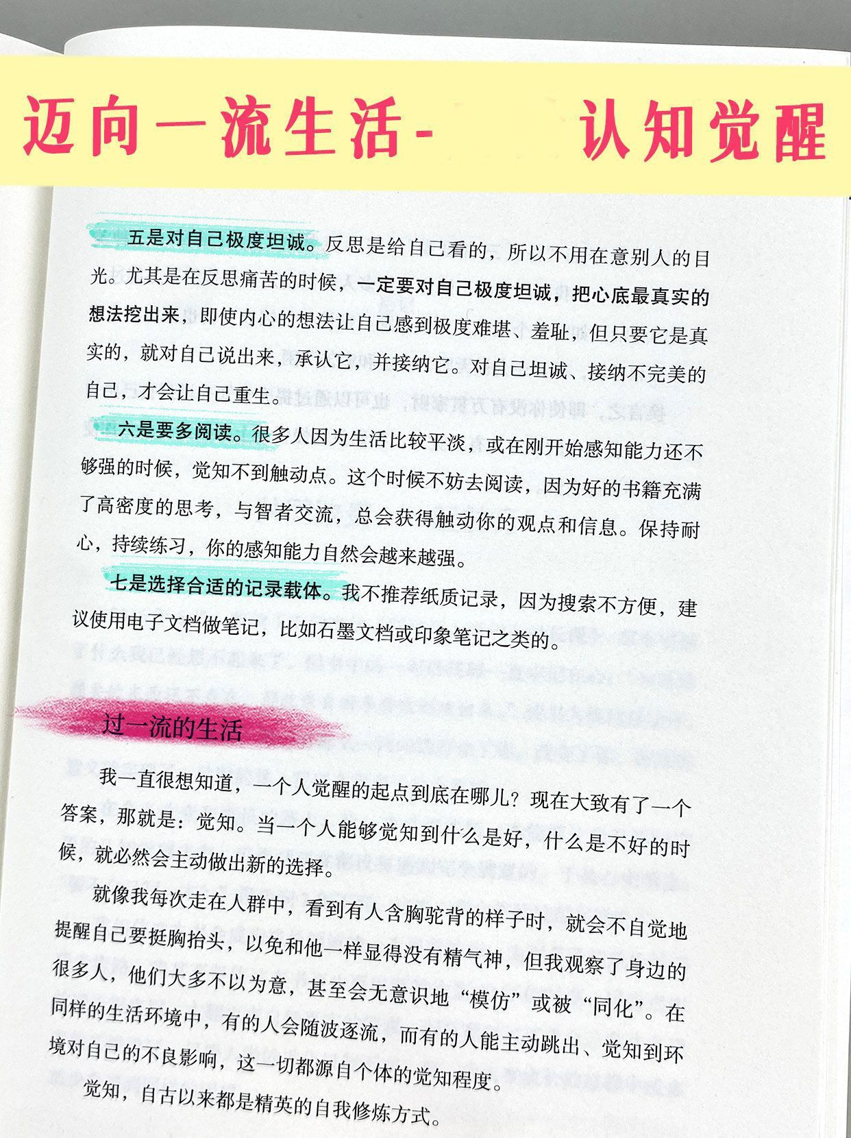 比如曾子的“吾日三省吾身”,富兰克林的“每日觉察十三种美德”……如今,我们不缺吃不缺穿,很多人生活富足,但他们未必能过上一流的生活。如果一个人缺乏觉知,那么即使每天锦衣玉食也可能感受不到幸福和喜悦,甚至还会被无聊、空虚和痛苦所困。