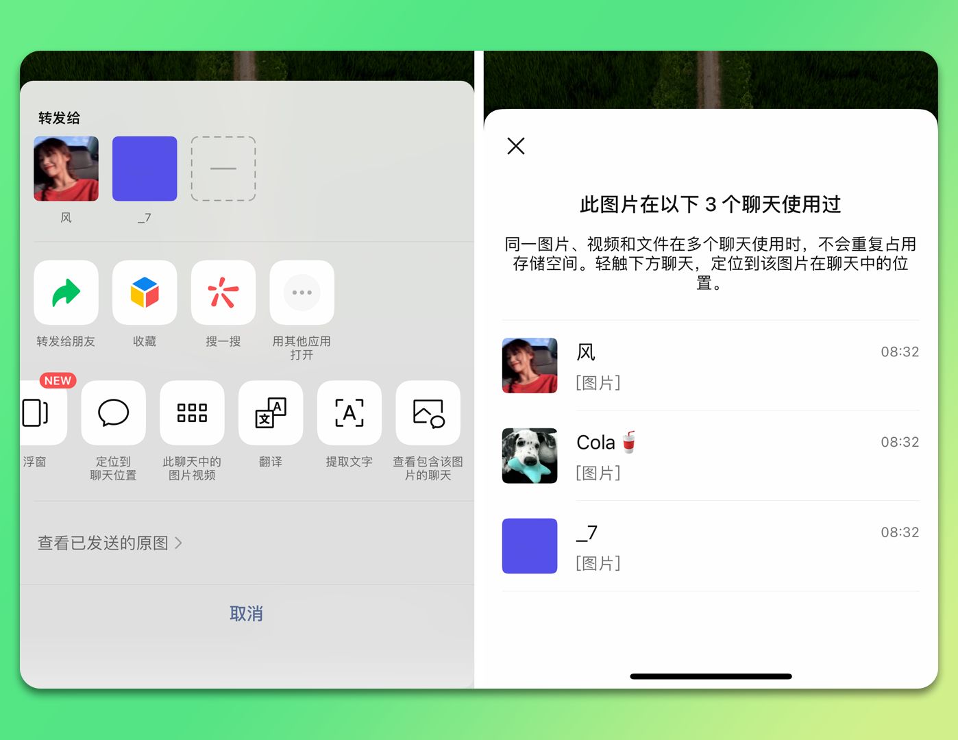 点击「查看该图片包含的聊天」,立马就能看到这张图在多少个单聊、群聊里被用过,下方还会列出具体的聊天列表,点一下就能一键定位到图片位置,再也不用翻遍聊天记录找图了。