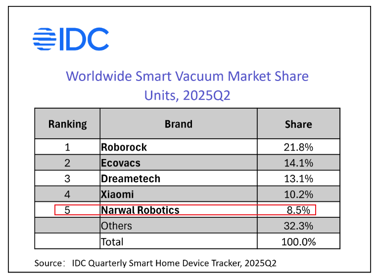 来自中国深圳的Narwal(云鲸)以8.5%的市场份额成功冲进全球前5,反超曾经的老美知名厂商iRobot。