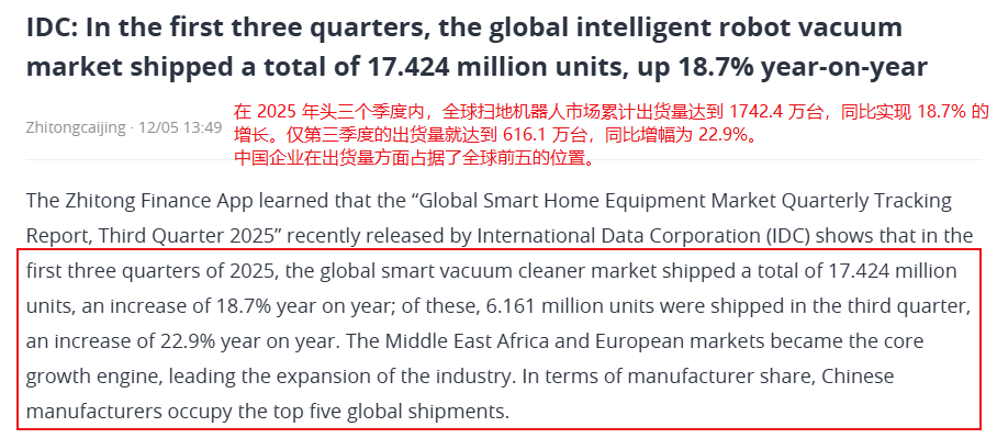 在2025年的前三个季度,全球智能吸尘器市场出货量高达1742.4万台,同比增长18.7%。其中,第三季度的单季出货量为616.1万台,同比增幅飙升至22.9%。