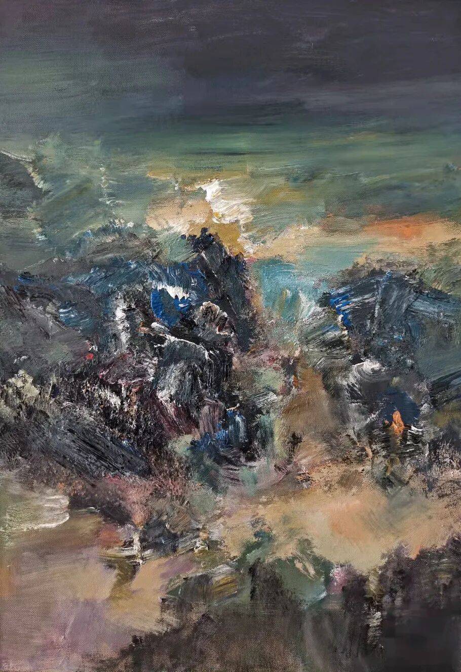 常颂的作品呈现出鲜明的复合特质,尽管精神层面是东方的,但物质表达却严格遵循纯正的西方油画语言体系。可以讲,是以西方绘画材料承载东方美学精神。他将写意精神注入其中,色彩的浓淡干湿不再是单纯的视觉呈现,而是成为“意”的抒发媒介。肌理的堆叠与笔触的挥洒,暗合文人画“气韵生动”的审美追求。这种转化并非表面的符号拼贴,而是将“意象”语言内化为创作逻辑,使作品在形式节奏上彰显出东方的审美韵律,以实现“用纯粹油画语言营造审美意境”的目标。绘画本体语言的魅力在其作品中不仅未因追求意象而削弱,反而保持了艺术的自律性和创作的自主性。这种以东方审美精神为“体”,西方形式法则为“用”,所创作的视觉艺术,并非简单的风格挪用,而是源于对文化本源的主体自觉。