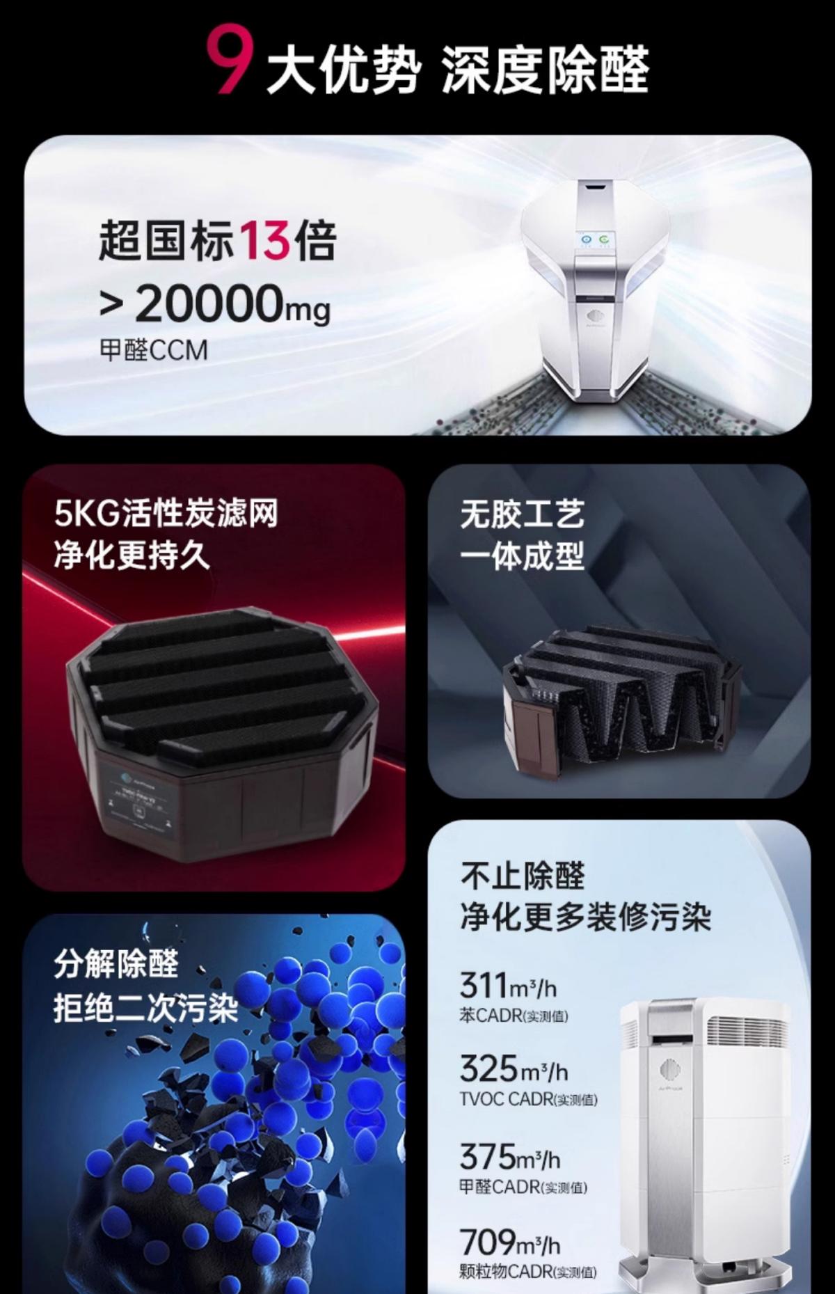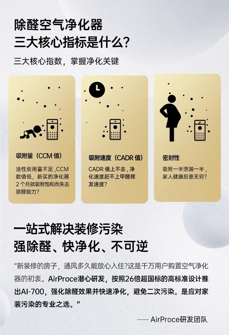 4、新家除甲醛一步到位 → AI700(甲醛CADR 543m³/h,甲醛CCM超国标26倍净化能力,双层活性炭滤筒)