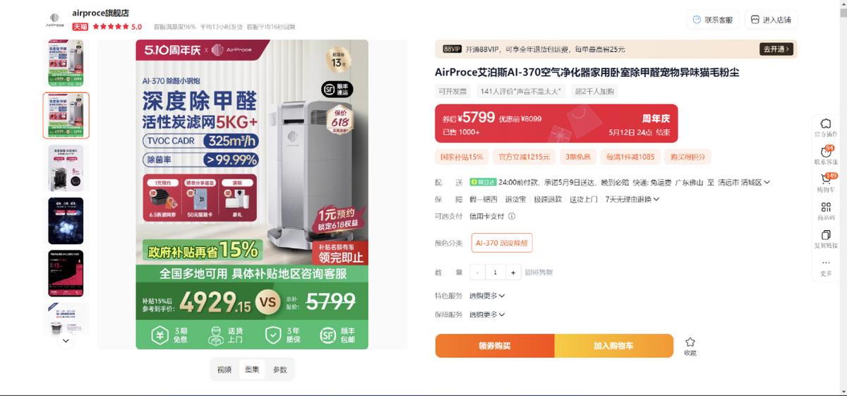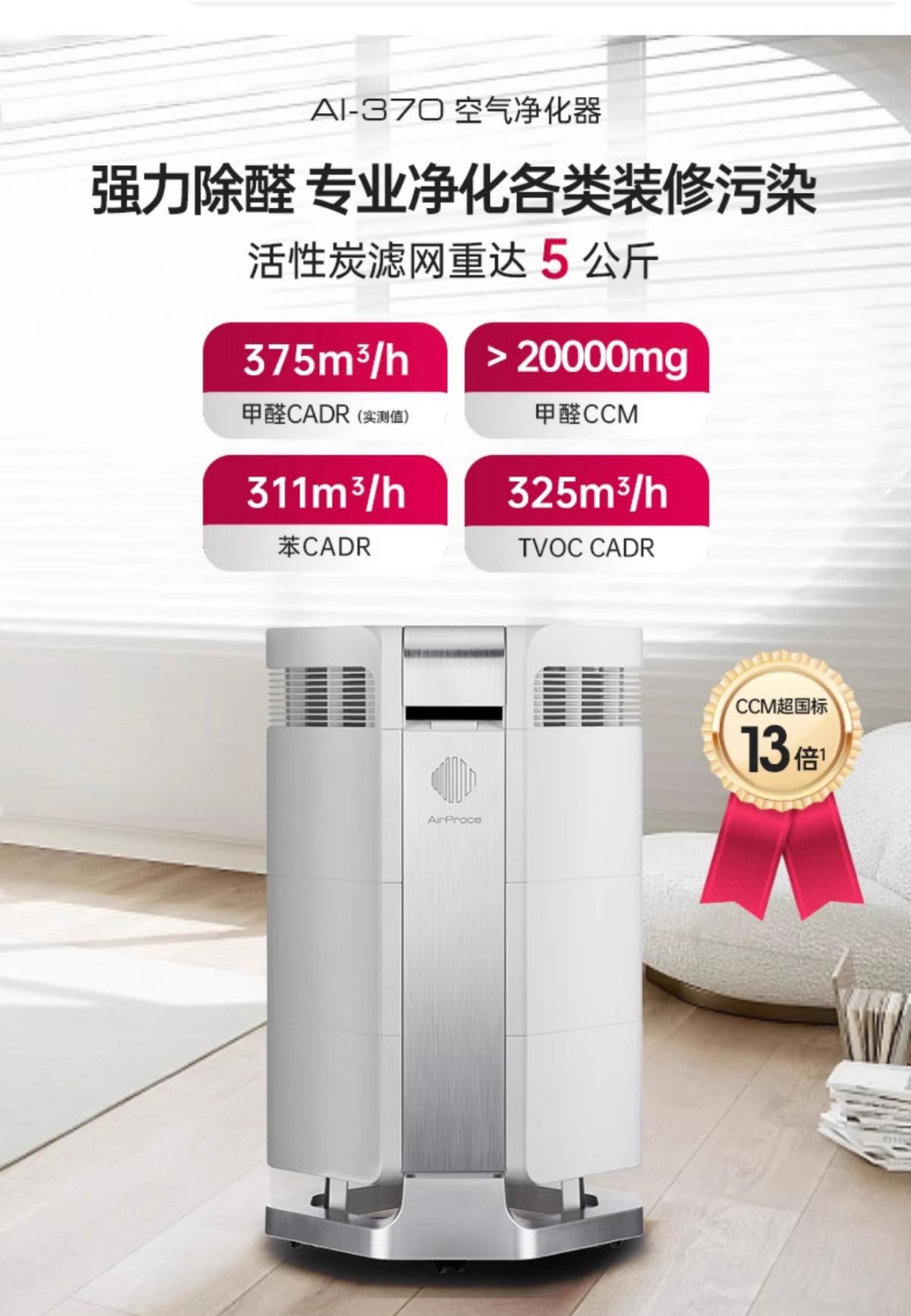 3、预算5K以内,目标高效除醛 → AI370(5kg无胶活性炭滤网,甲醛CCM超国标13倍净化能力)