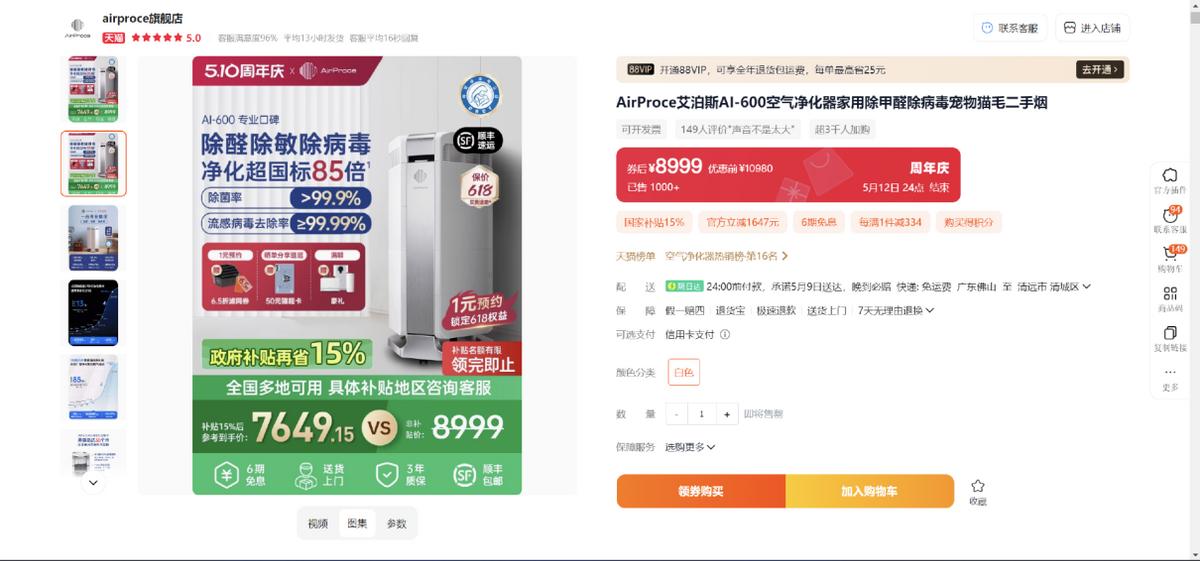 AI600是艾泊斯的当家花旦,母婴家庭中的明星产品,主打“全效型净化器”,在针对各种污染源的净化上非常均衡且没啥短板,售价8999元(国补价更低),颗粒物CADR达720m³/h,甲醛CADR为391m³/h,TVOC CADR为400m³/h,颗粒物CCM更是达到了惊人的1022000mg(国标的85倍),甲醛CCM也达到20000mg(国标13倍),真正做到了高效、长效、持久净化。