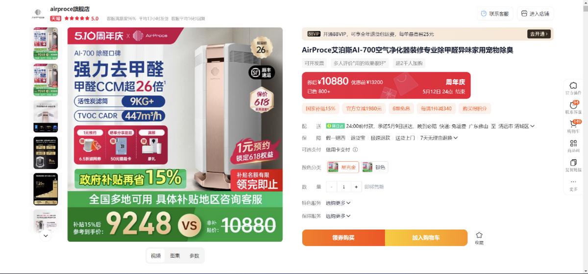如果你的家是刚装修完的新房,希望一步到位快速处理装修遗留的全套污染源,比如甲醛、苯、甲苯、TVOC等,那AI700一定是更好的选择。它是目前艾泊斯除甲醛性能最强的旗舰机之一,售价10880元(国补价更低),颗粒物CADR为634m³/h,甲醛CADR高达543m³/h,苯类CADR接近470-515m³/h,TVOC CADR为447m³/h,真正做到了“全面净化”装修污染。