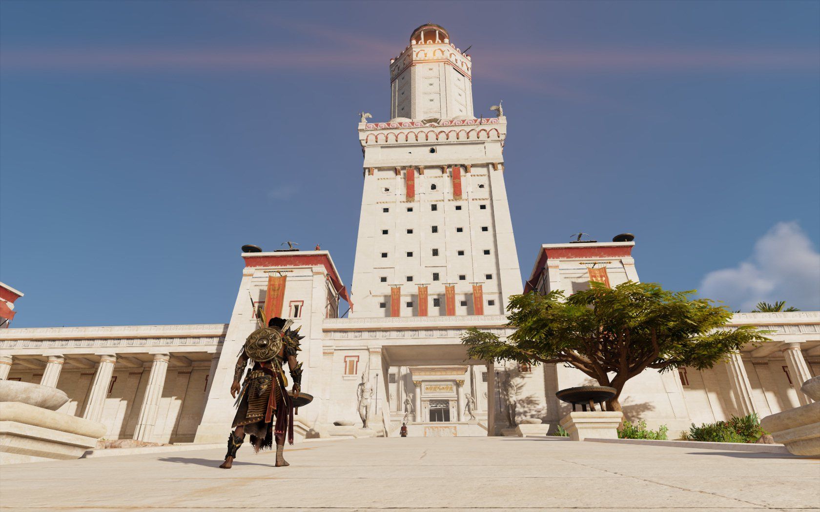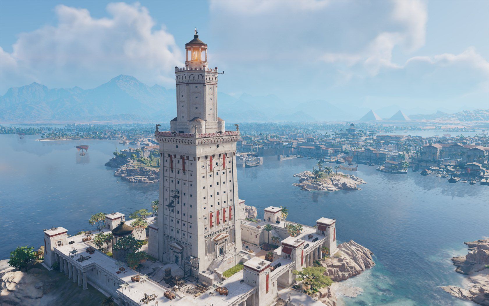 游戏里最震撼的场景之一,绝对是那座被誉为“古代世界七大奇迹”之一的亚历山大灯塔。巴耶克可以攀爬到灯塔顶端,俯瞰整座城市和蔚蓝的地中海。这座由托勒密二世下令建造的灯塔,高达135米,是当时世界上最高的人造建筑。