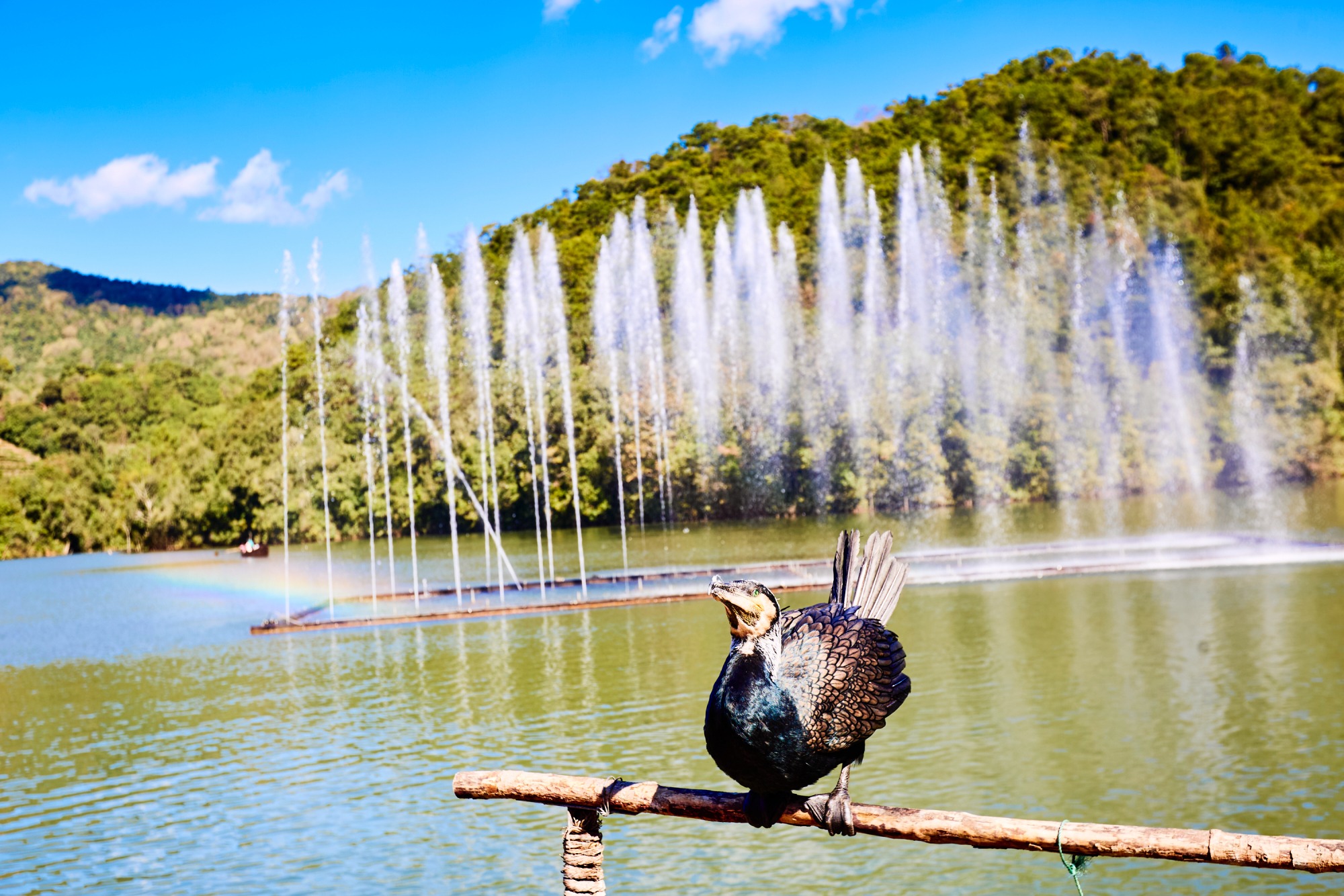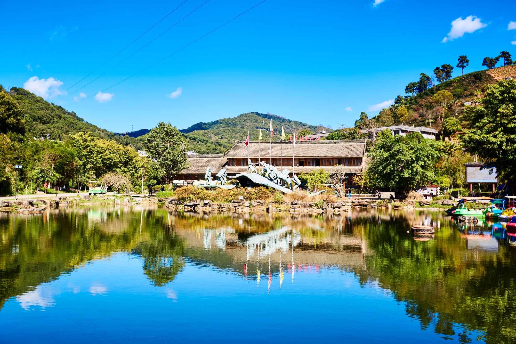 漫步湖畔,商街中的热闹渐渐远离,天空将湖水染成湛蓝,连绵群山和岸边的绿树、古建投映其中,仿佛一个远离喧嚣的世外桃源。