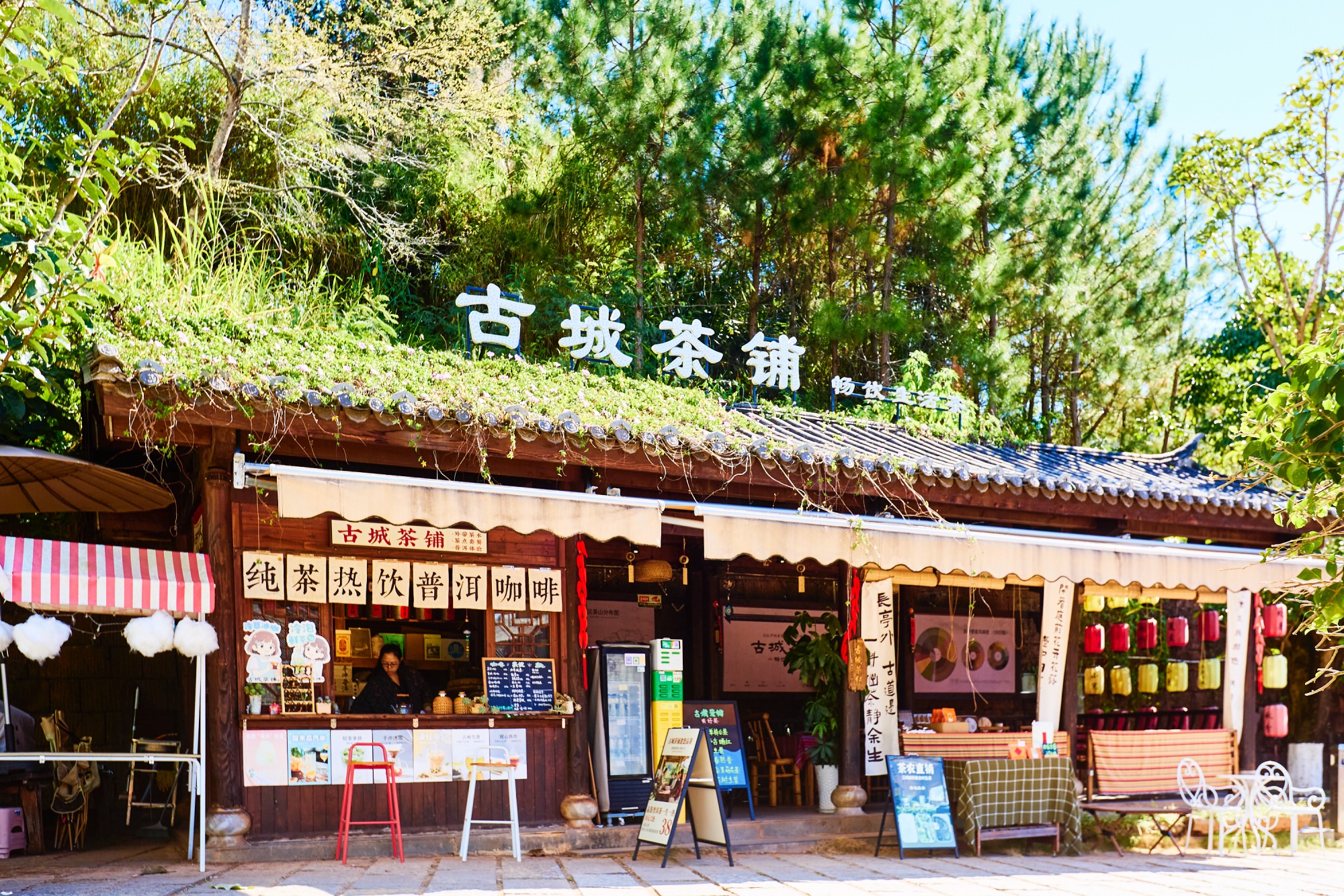 茶铺茅草顶搭配木质招牌,掩映在一片绿树丛中,带着几分江湖气。逛累了不妨在小店里歇歇脚,点上一杯茶或普洱咖啡,晒着太阳享受山野间的惬意时光。