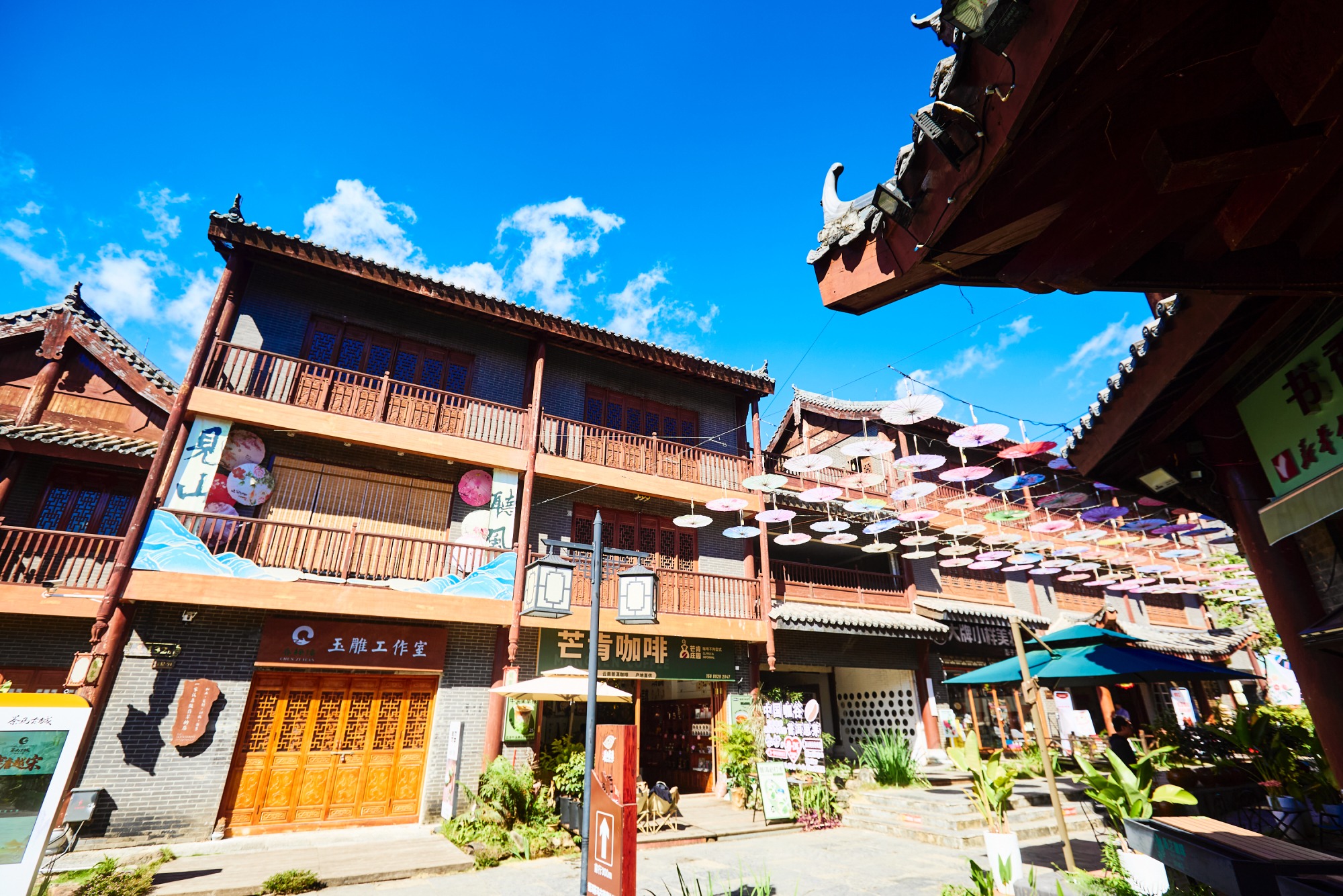 砖木混合小楼兼具傣式与中式建筑特色,二楼的木质阳台、整齐悬挂的油纸伞搭配上檐角中露出的蓝天白云,每一处定格都充满诗情画意。