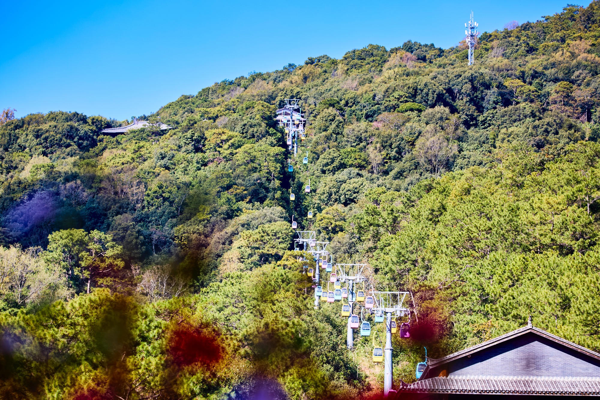 彩虹索道车仿佛盛开的花朵穿梭在茂密绿林中,坐在缆车上,山林尽在脚下,茶马古道全貌和山野景致次第展现在眼前,令人心旷神怡。