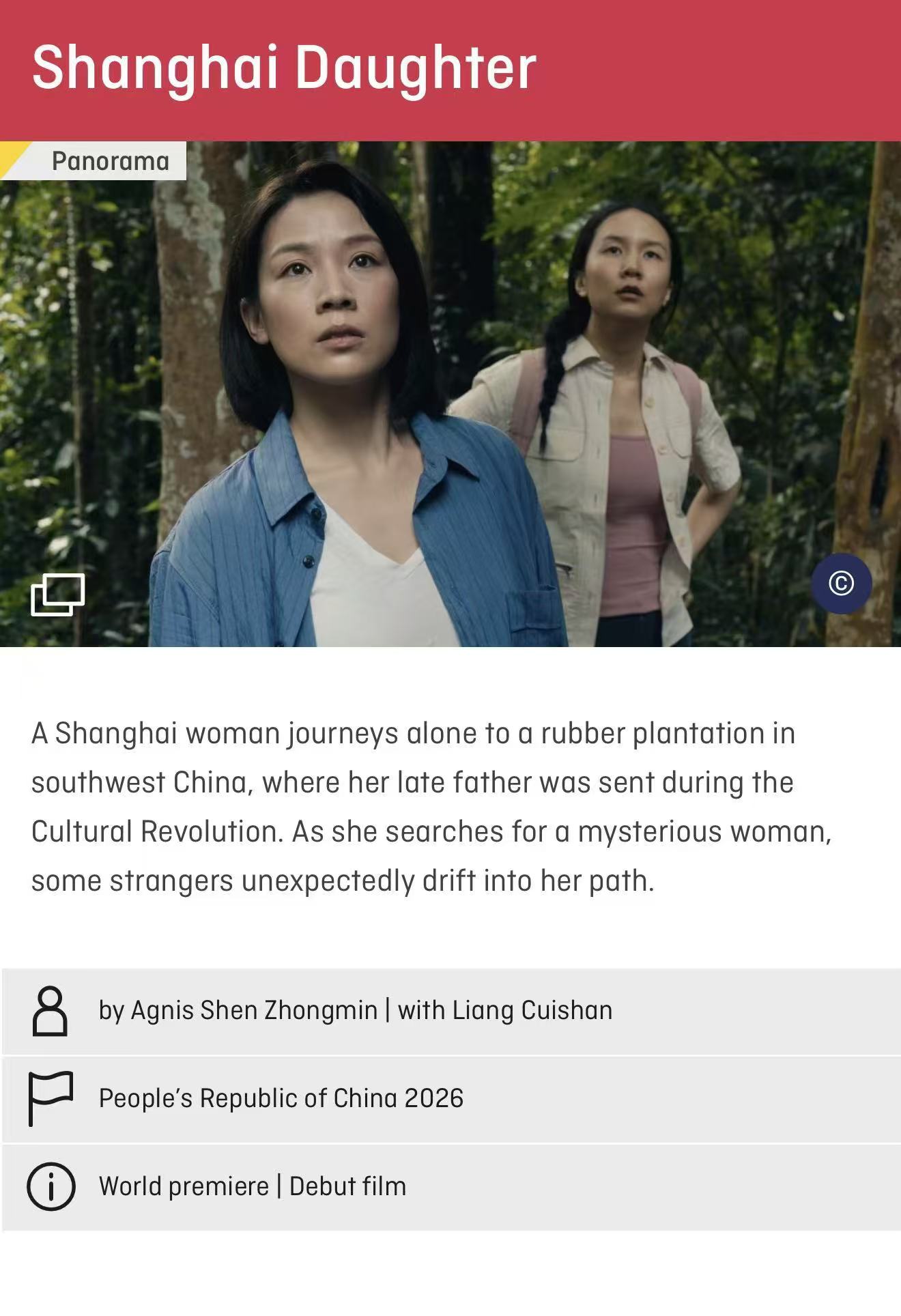 柏林电影节全景单元向来以关注多元文化与人文关怀著称,《上海女儿》的入围,不仅是对影片影像实验手法与叙事价值的认可,更标志着华语女性题材作品在国际舞台的持续发声。当上海的弄堂记忆邂逅西双版纳的雨林风情,当个人命运与时代印记相互交织,这部影片终将以独特的东方美学,让世界看见中国女性故事的独特魅力。期待梁翠珊与主创团队携作品亮相柏林,让这份跨越山海的寻根之旅,收获更多国际掌声。