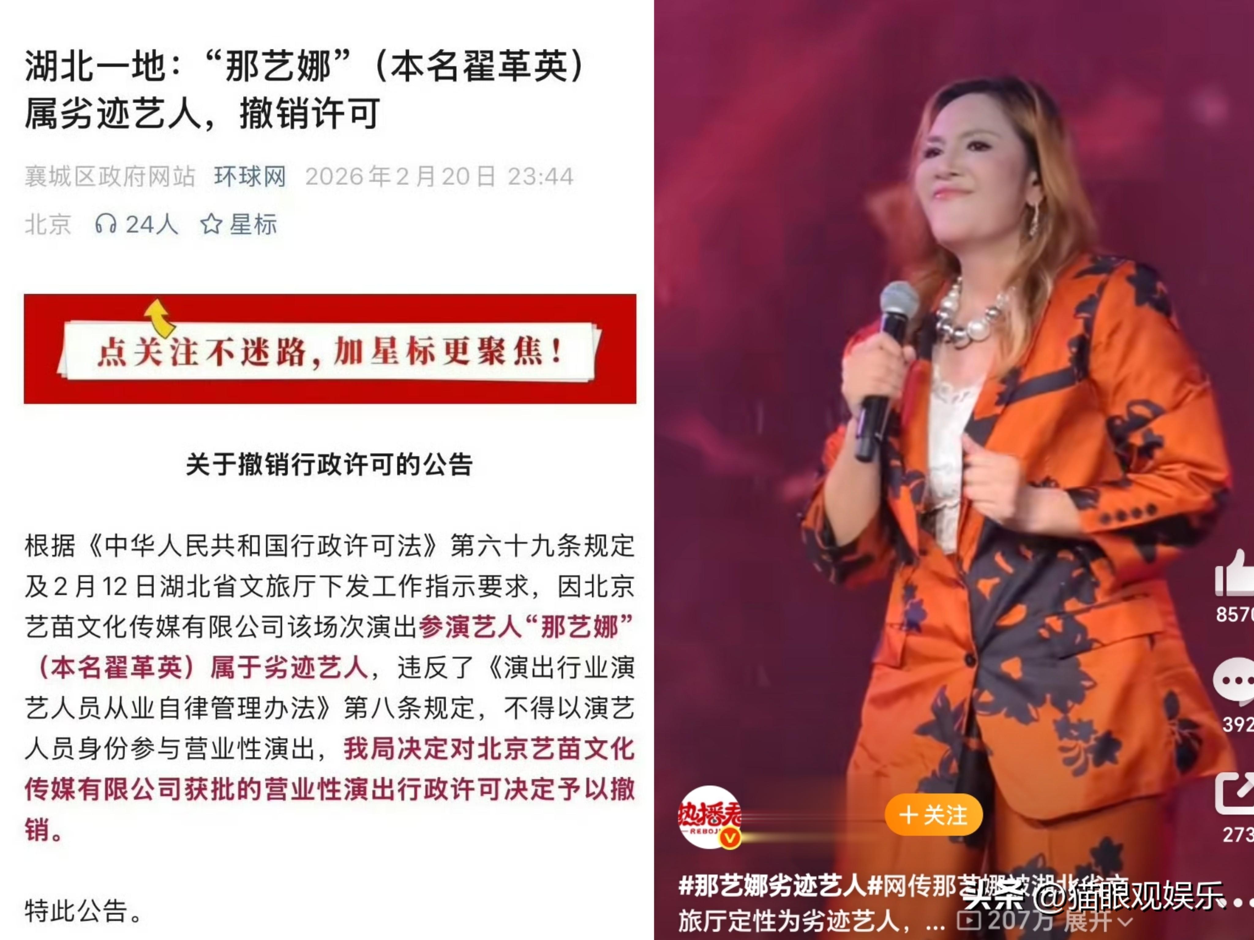 2026年2月12日,湖北省文旅厅重拳出击,依据《行政许可法》《演出行业演艺人员从业自律管理办法》,正式将网红那艺娜(本名翟革英)定性为劣迹艺人,直接撤销其襄阳演出许可,线下商演彻底叫停。