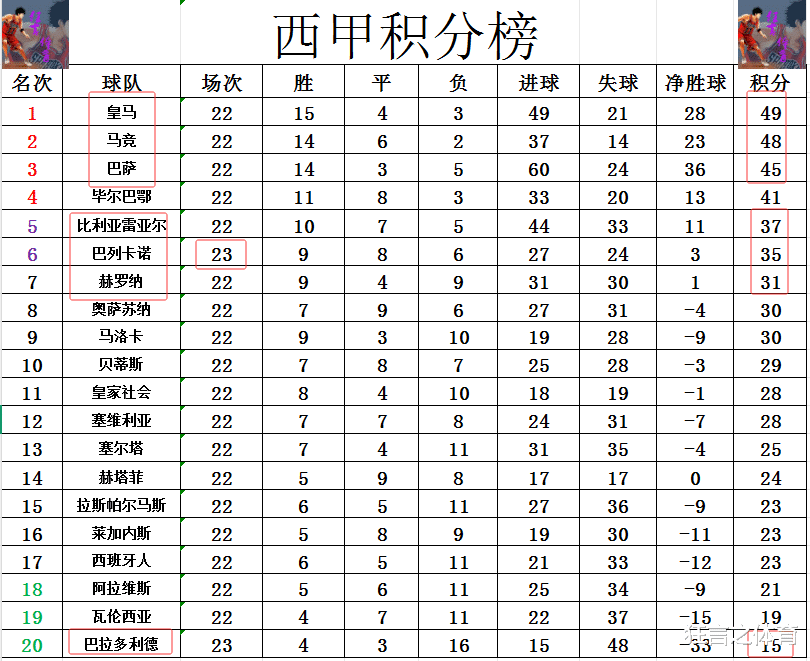 积分榜方面,皇马上轮爆冷输球后被马竞和巴萨将分差缩小,本轮皇马将在主场和马竞展开榜首大战,皇马不能再输球,再输的话那又要丢掉榜首了。巴列卡诺这一波9轮不败,让他们稳固了前6的位置,差比利亚雷亚尔2分排在第6,输球的巴拉多利德继续垫底。