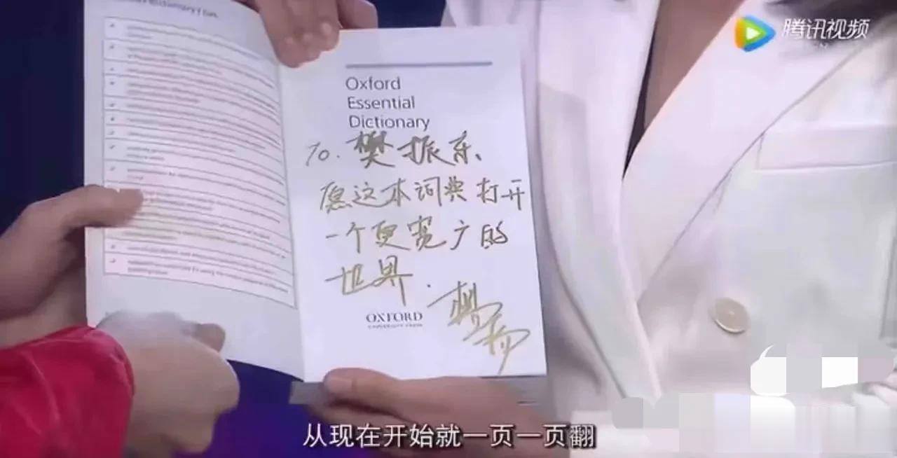杨杨姐送给樊振东一本英语字典并给东哥题词:樊振东,愿这本词典打开一个更宽广的世界!