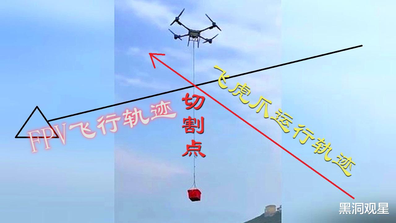当然这种飞虎爪是经过特殊改装的。首先在虎爪内部开刃,越锋利越好。如果FPV无人机沿东西方向飞行,飞虎爪就绕到FPV后方,从南北方向横切过去。此时双方运动轨迹形成十字交叉,等飞虎爪钩住光纤的那一刻,靠拉力把光纤割断。