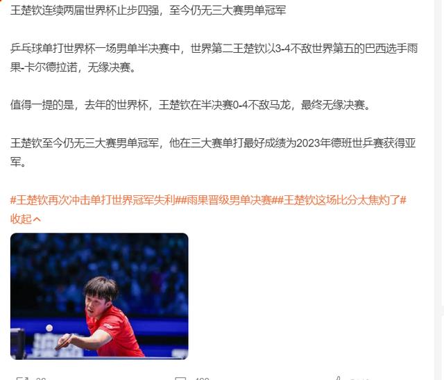 然而,在此次澳门世界杯的男子比赛中,王楚钦不敌巴西球员雨果,止步四强,成为季军,对于很多人来说都不能接受。