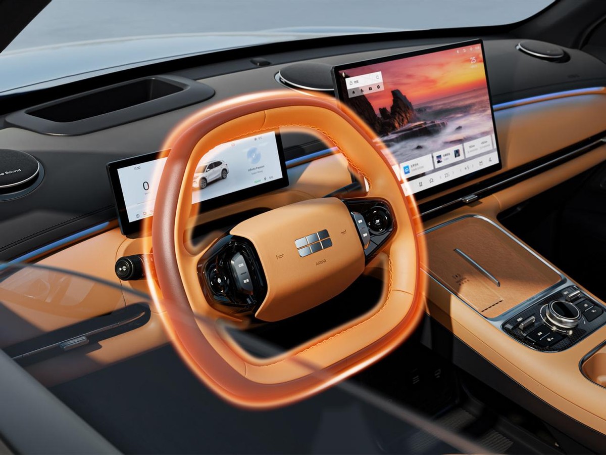 在舒适性方面,2026款吉利银河星舰7 EM-i同样下足了功夫。前排采用了双层隔音玻璃,这一设计极大地提升了车辆在高速行驶时的静谧性,让车内乘客能够享受更加安静舒适的乘坐环境。座椅的设计灵感源自中国传统的太师椅,巧妙地融合了人机工程学原理,搭配上10层棉花糖SPA座椅面料以及14点按摩功能,即便长时间乘坐,也不会感到疲惫。更为贴心的是,新车不仅新增了方向盘加热功能,还在后排也增加了座椅加热功能,在寒冷的天气里出行,能够让乘客感受到满满的幸福感。此外,车辆还配备了16扬声器的Flyme Sound无界之声音响系统,配合头枕音响,为乘客带来沉浸式的影音享受。