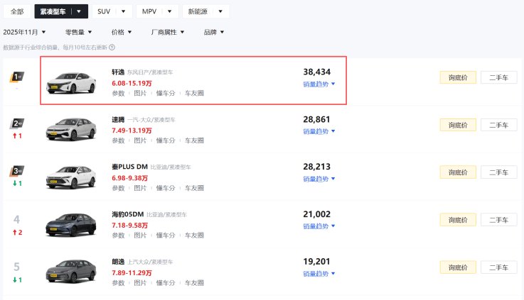 在当前消费市场环境中,年轻家庭用户若购买一台十万级的家庭通勤代步车,最看重的是“无明显短板+高性价比”,他们不盲目追求花哨功能,更看重“长期成本可控、日常使用省心”等诉求。在此市场需求背景下,我们看到紧凑型轿车细分市场给出了精准反馈,11月该细分市场销量排行榜显示,日产轩逸、大众速腾分列榜单的1、2名,其中轩逸单月销量更是拔高到38,434辆,这证明在当下,10万级轿车的“稳定服役、少花钱”仍是消费者决定购买的核心门槛,省钱省心是大多数普通家庭、上班族的底线。