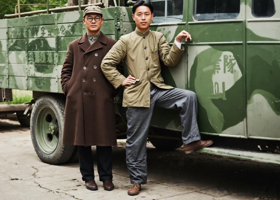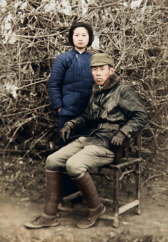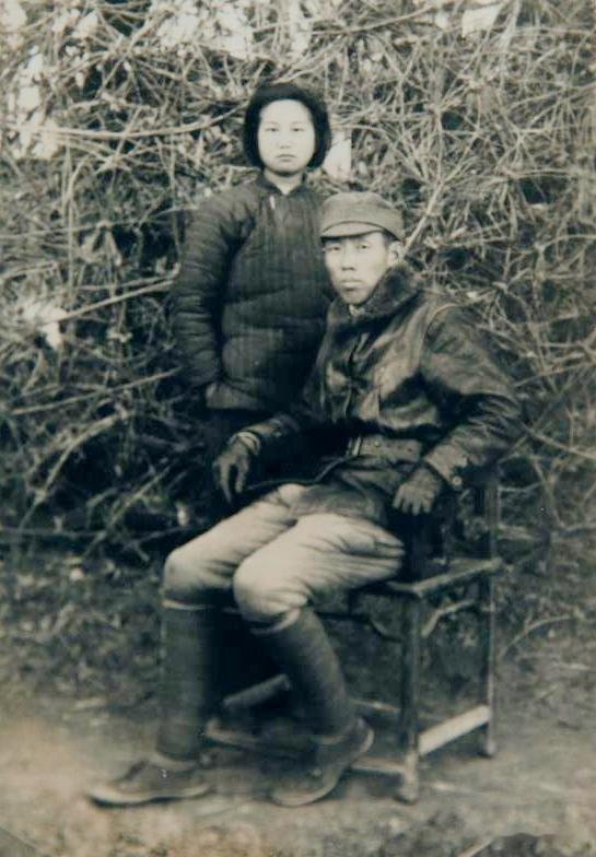 1943年11月,刚伤病初愈的胡文杰坐在木椅上,上身穿着因立功获得的缴获日军翻毛皮夹克,手套裹着未完全康复的手;身后的唐渠身着朴素布衣,站姿拘谨却目光紧随着他,两人神情都透着严肃——没有热恋的轻松,只有硝烟里的沉重心绪。