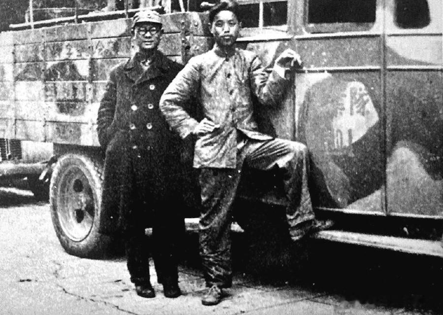 站在车旁的两人,左是叶进明,右是罗志诚:叶进明戴着眼镜,神情沉稳;罗志诚则随意地将腿搭在卡车踏板上,姿态里带着革命者的松弛。