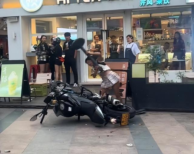 只见她一边打一边骂,终于她也是发现了,摩托车并没有什么损伤,自己反而累得够呛,而这也是让她更生气了。