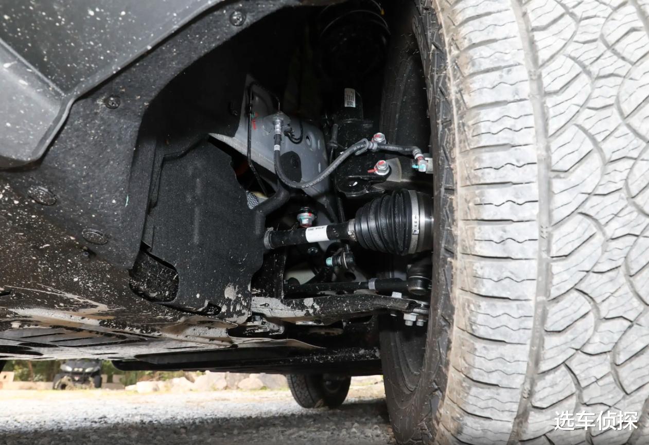 在悬挂结构方面,捷途山海T2有所更新,后轴由于安装了电机,前驱版的四连杆悬挂无法使用,在四驱版上更换为H臂多连杆,H臂采用铝合金材质,降低簧下质量,但缺点明显,那就是前悬挂依旧是麦弗逊,下控制臂为单薄的冲压钢板,越野时遇到冲击,容易出现问题,相比同价位双叉臂的车型,还需要提升。