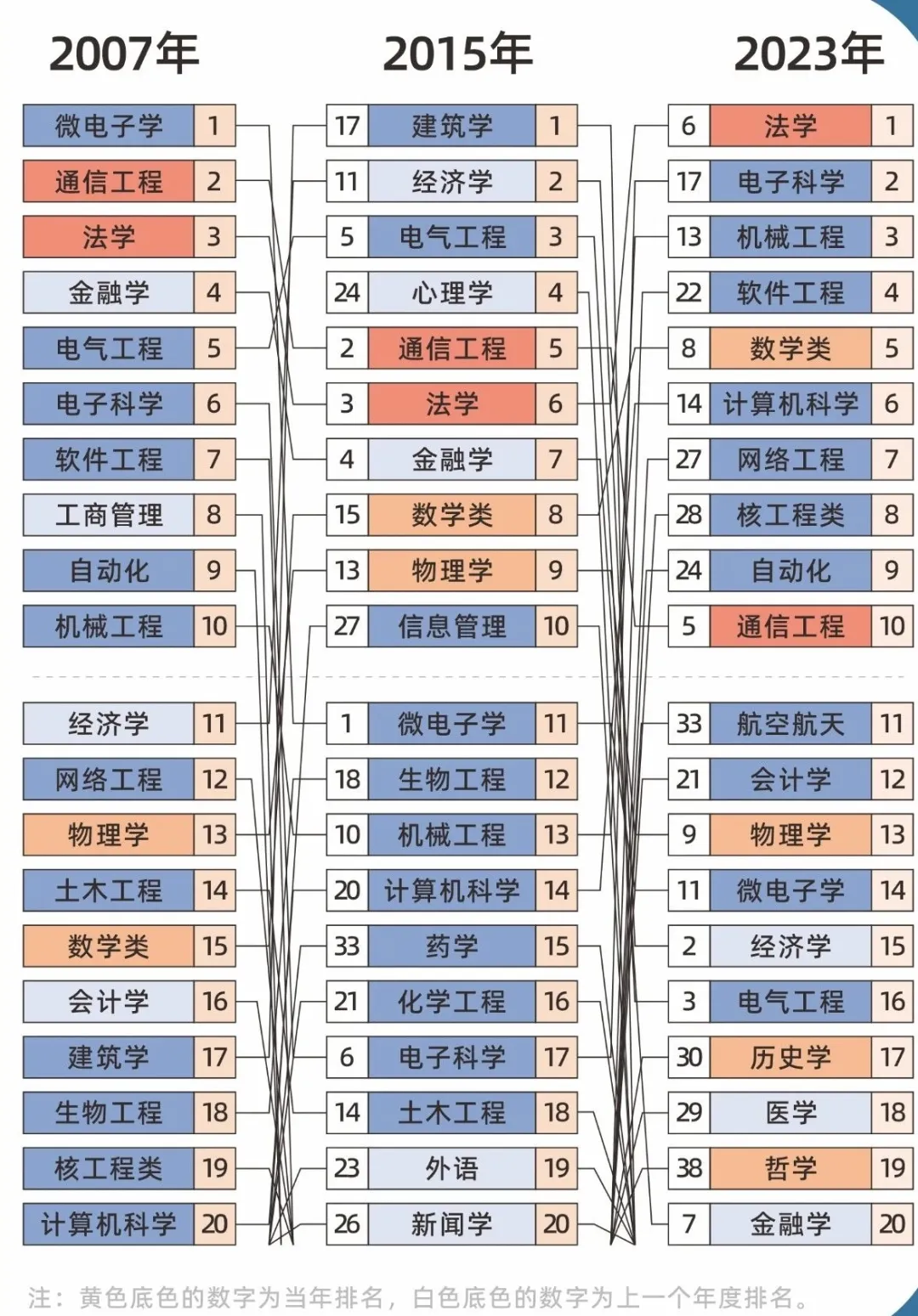 翻开2007年、2015年、2023年的专业榜单,你会发现根本就没有永远吃香的专业,15年建筑学还坐享头把交椅,现在已经消失不见。