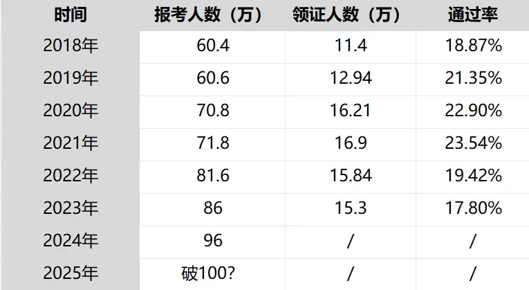 报考人数逐年增加,2025年预期破100万,但通过率却逐年降低,而公务员的报录比更是一言难尽,