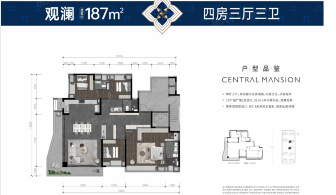 先要隆重介绍的是建面约187㎡的四室三厅三卫户型,三厅包括客厅、餐厅和电梯厅,位于小区4#、5#号楼的2号房,得房率超100%;户型端厅结构,客厅实现了双面采光,阳台总长约16米;独立采光的电梯厅约15㎡;套房主卧面积约42㎡。