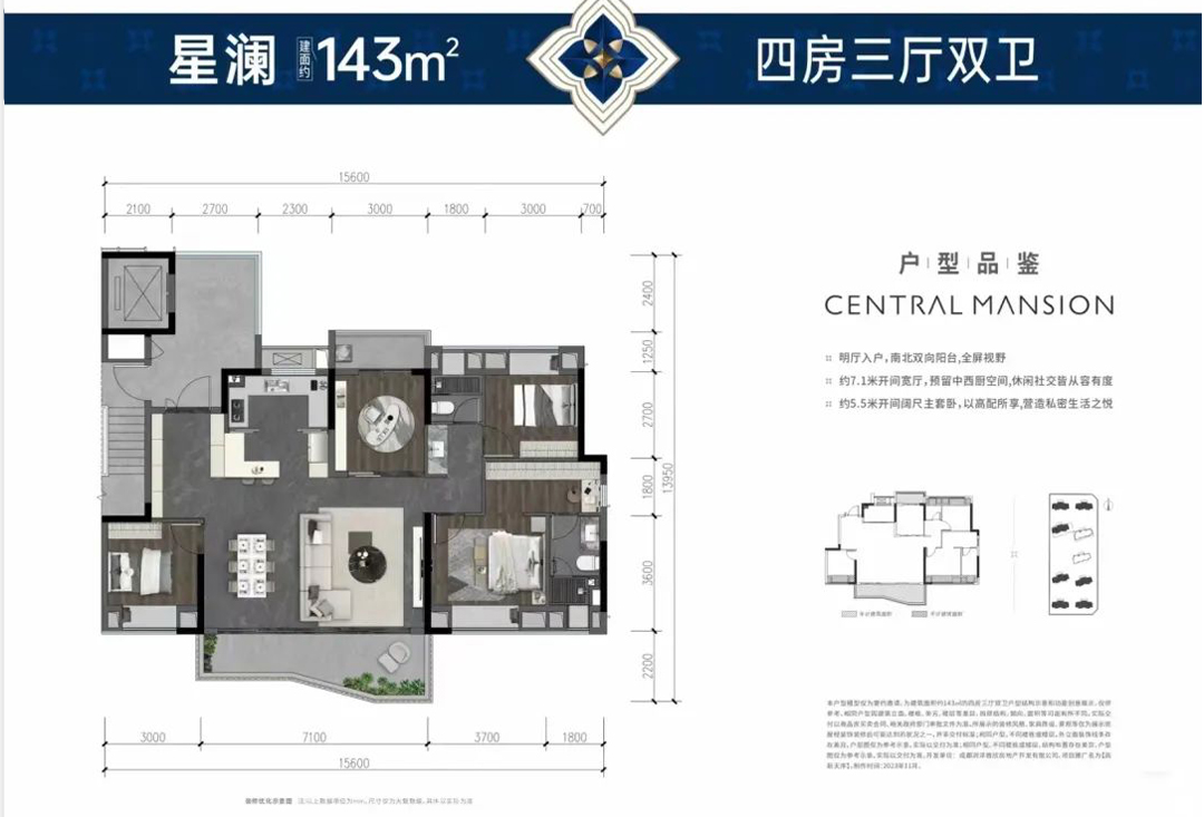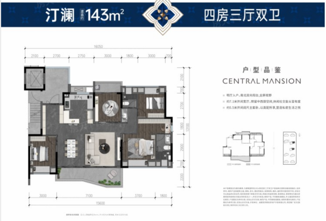 143㎡户型则是高新天序的主力,虽然有汀澜(位于4、5号楼的1号房)和星澜(除4、5号楼的其余户型)的命名之分,但户型结构没有本质区别,都是四房三厅双卫结构。该户型的产品力也很强,得房率约105%;独立采光电梯厅约13.5㎡;预置中西厨空间和独立玄关;开间7.1米的阳台还局部扩大,最大进深2.2米。