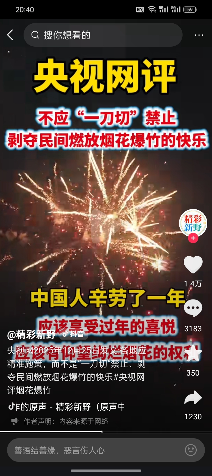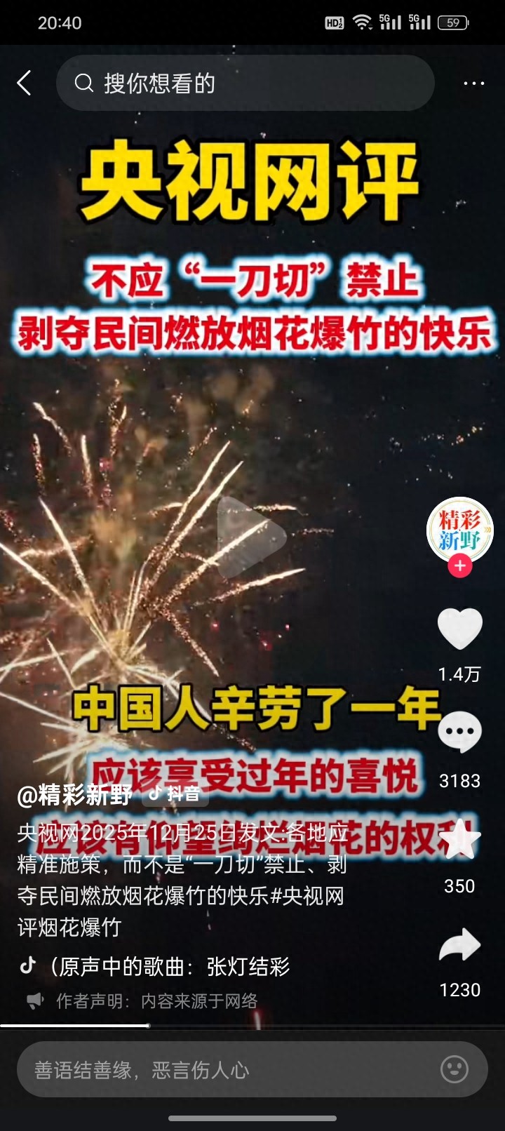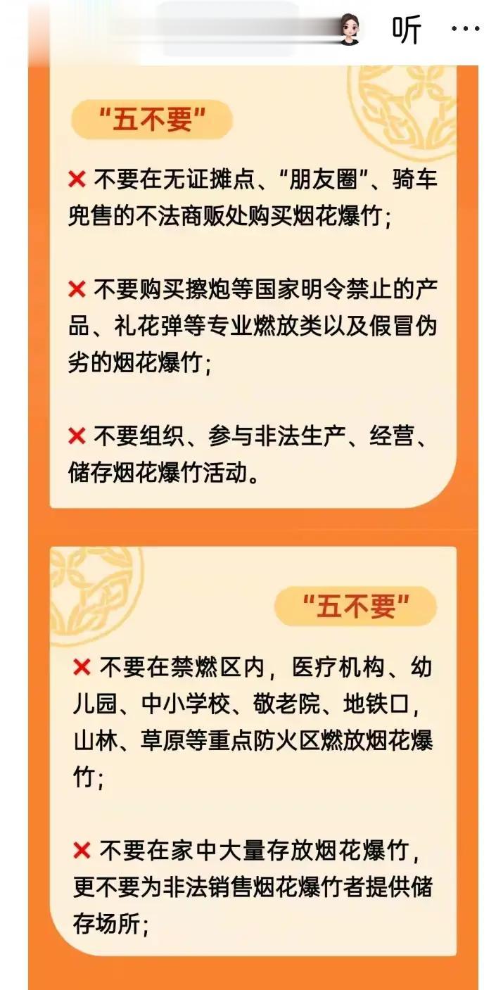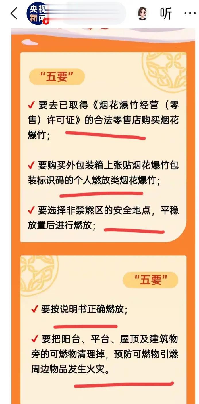 1月11号,央视新闻针对燃放烟花爆竹有新的报道,这次重点提到了大家在燃放烟花爆竹的“五要”和“五不要”,值得特别是注意的是,央视并没有提到让大家禁止燃放烟花爆竹,这一点是非常明确。大概表达的意思就是大家必须要到合规的烟花爆竹经营场所,购买符合个人类燃放的烟花,在被允许燃放烟花爆竹的区域进行安全有序的燃放。而不能跑到一直绝对禁止的区域,进行燃放,例如飞机场,高铁场,还有商业区等等一些人员密集和存在火灾隐患的地方,这一点是非常的明确的。