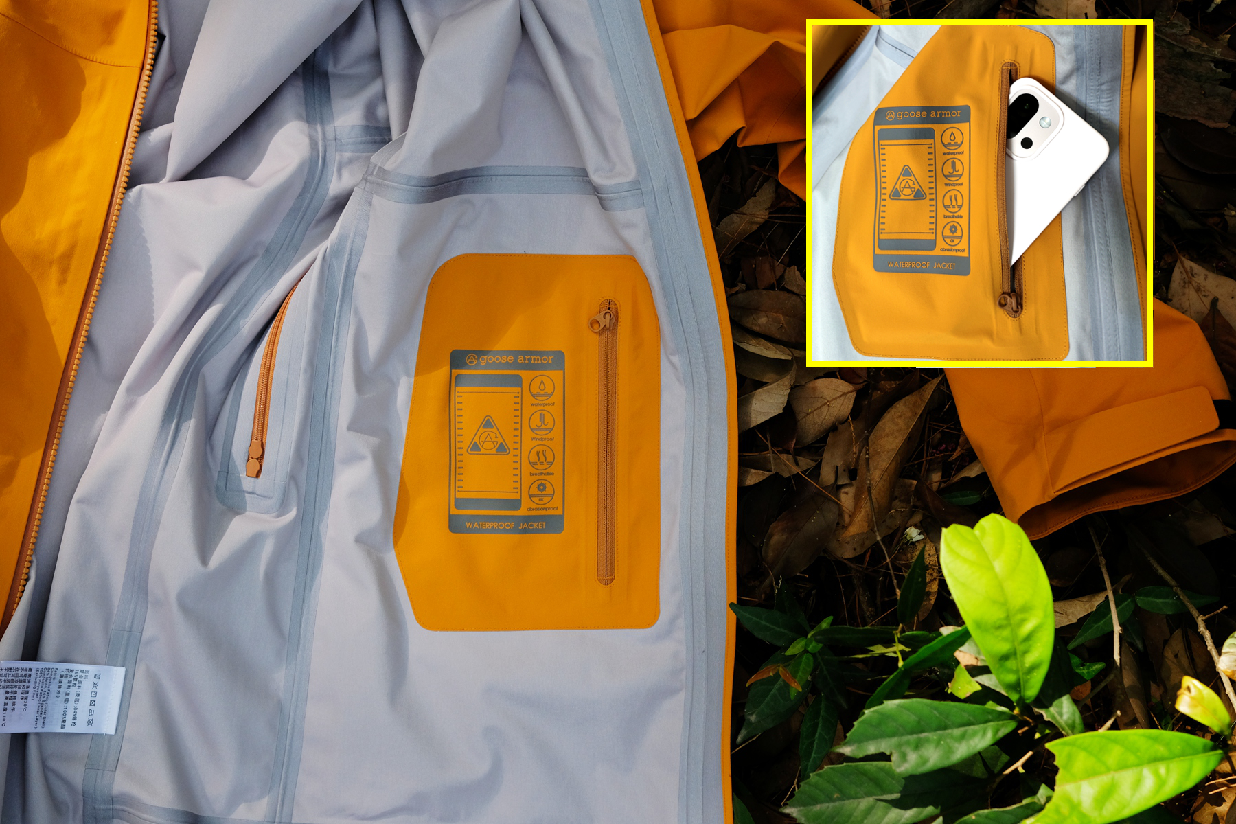 冲锋衣内侧还有带拉链的口袋,放手机这样的的贵重物品最合适了,拉链锁定避免丢失,放着特别安心。