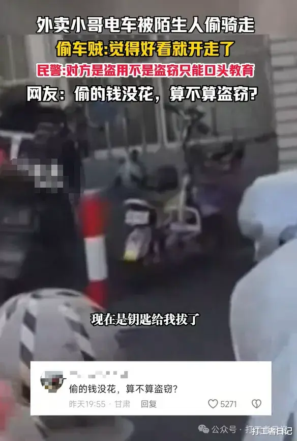 偷窃的概念,自古便是一个约定俗成的共识。如果这种不问而取偷外卖车的行为,还能被算作盗用,那么基本上算是一个击穿公序良俗的惊雷。