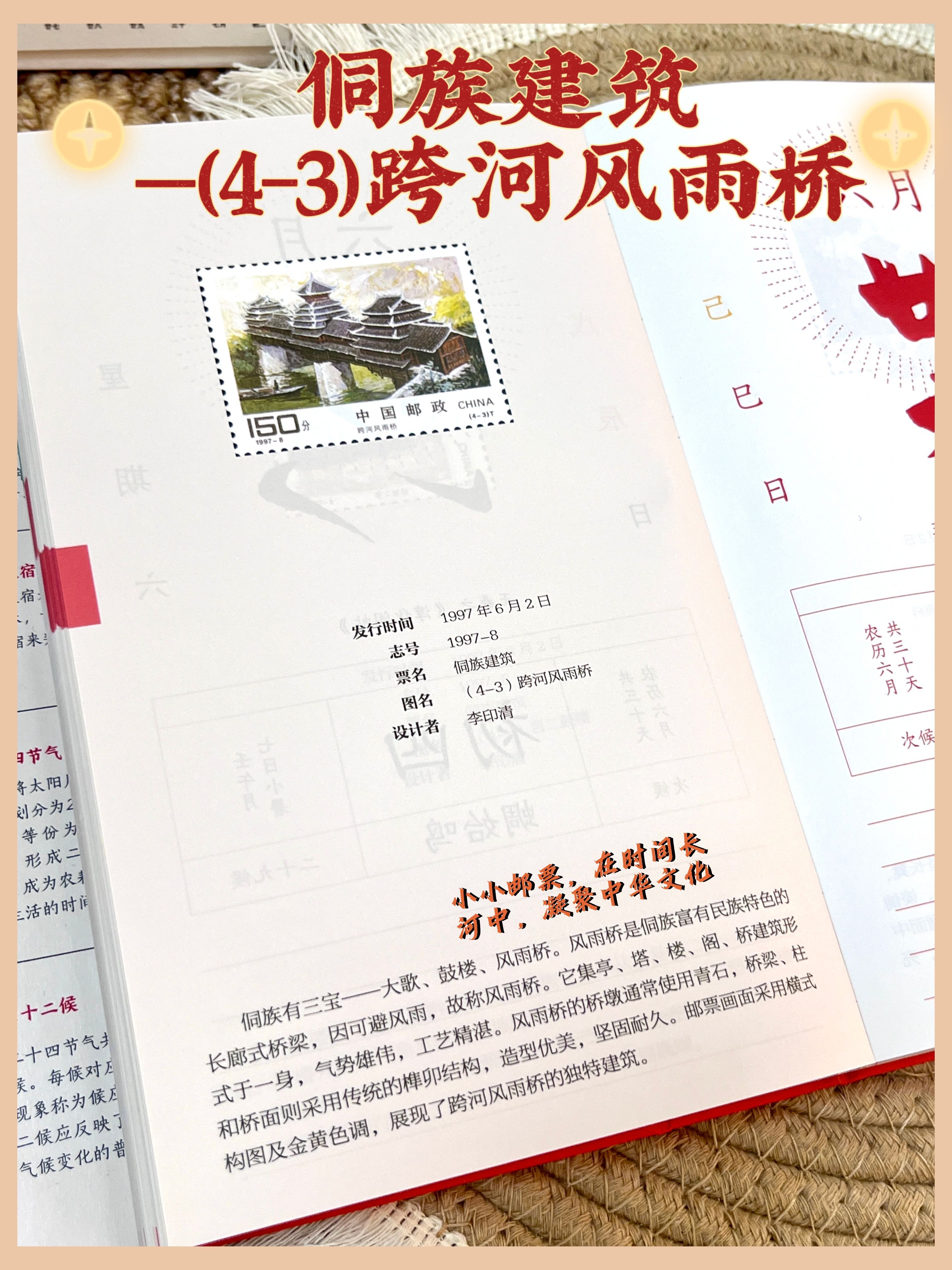 侗族文化中,有三件珍宝——大歌、鼓楼和风雨桥。风雨桥,以其遮风避雨的功能而得名,是侗族建筑中一道亮丽的风景线。这种桥梁不仅是一座桥,更是集亭台、塔楼、阁楼等多种建筑元素于一体的艺术杰作,展现了侗族建筑的宏伟与精湛工艺。风雨桥的桥墩多采用坚固的青石建造,而桥身、柱子和桥面则运用了传统的榫卯技术,既美观又结实。邮票上的设计采用了横向布局和金黄色彩,生动地捕捉了风雨桥横跨河流的壮观景象。