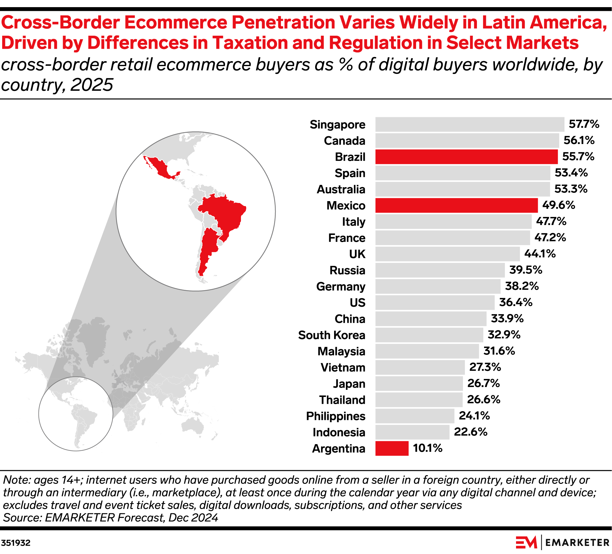*拉美地区跨境电商渗透率 巴西55.7%,墨西哥49.6%