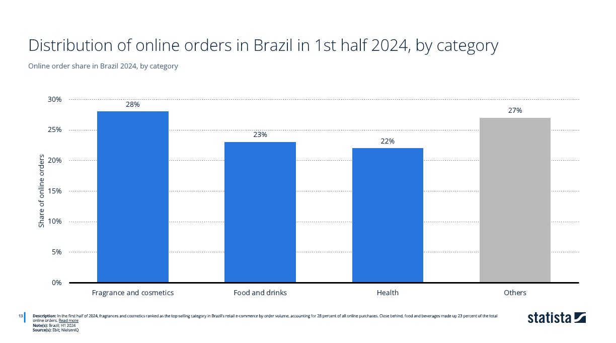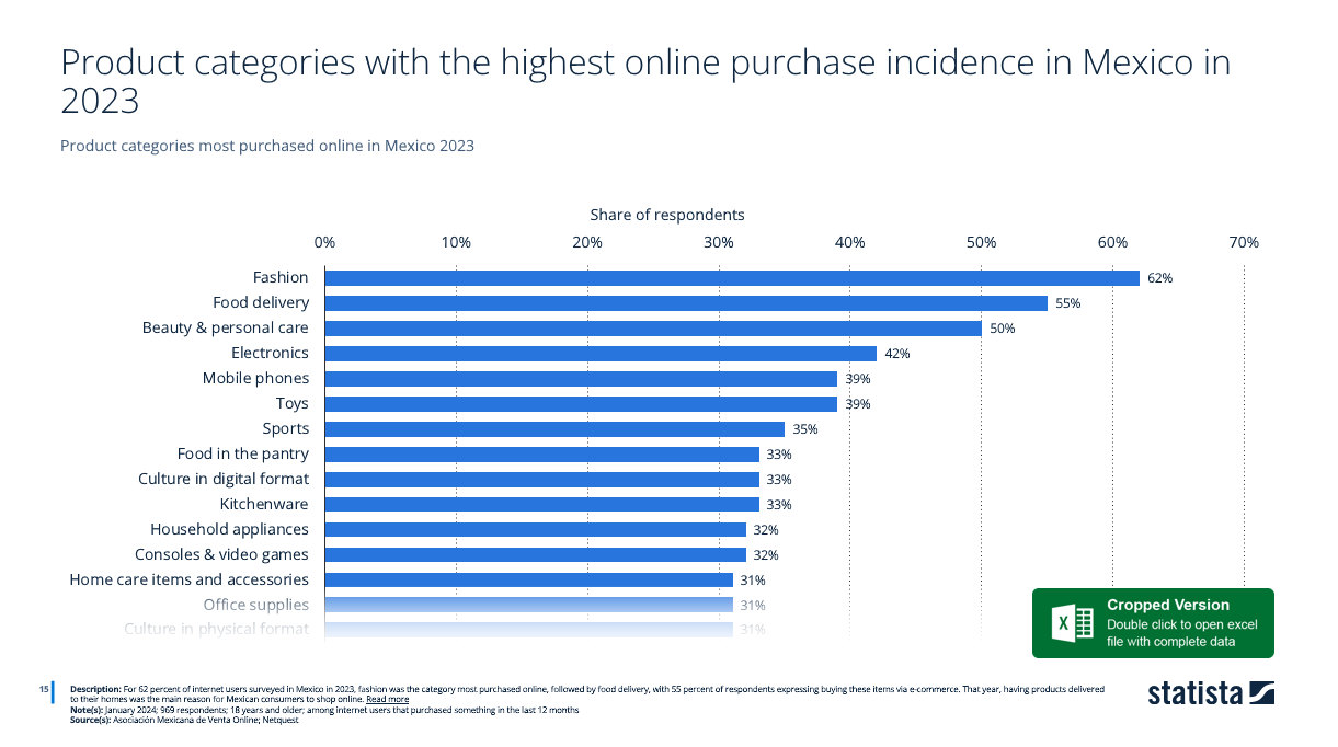 拉美地区市场电商细分品类根据 Statista Digital Market Insights 的数据,2024 年拉美地区实体商品零售电子商务收入估计将超过 1460 亿美元。到2029年,该地区电子产品类别的收入预计将超过650亿美元,而预测时尚单品的收入将达到约 414亿美元。从预估数据来说2025年时尚品类将迎来比较大的销售提升。