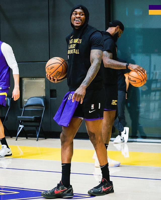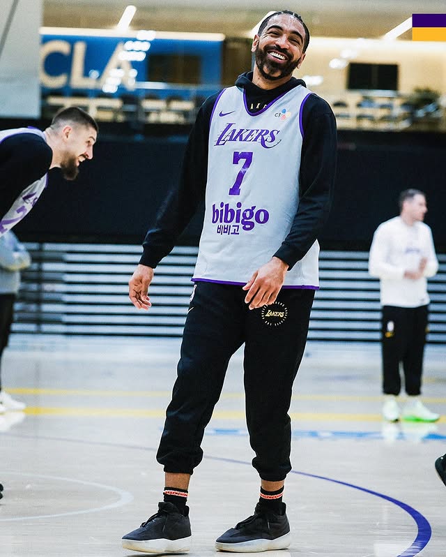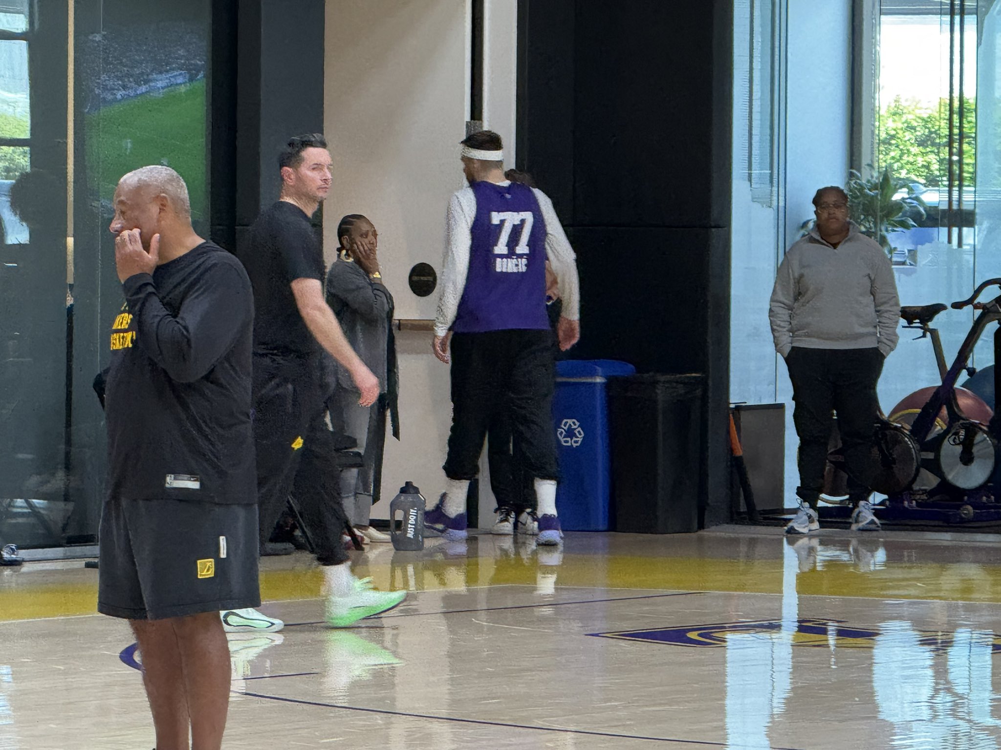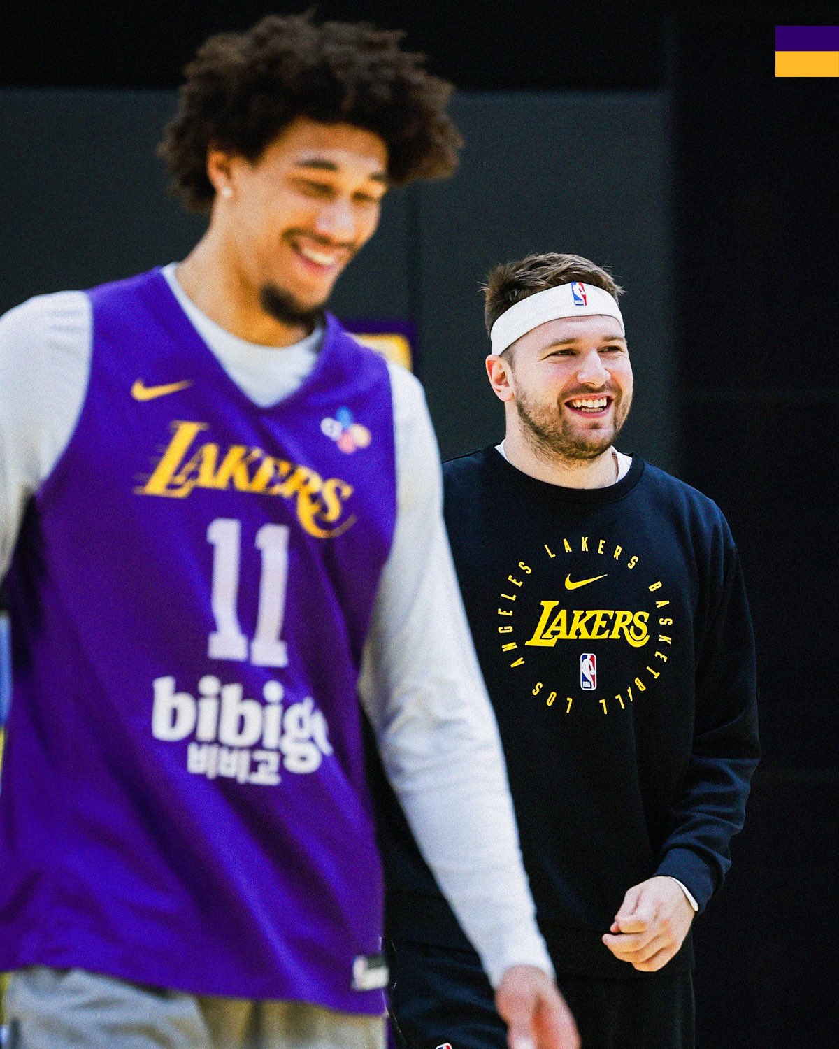 詹姆斯身穿黑色训练服,满脸严肃十分专注;东契奇则是继续佩戴白色发带,满脸笑容十分开心,文森特、海斯和范德比尔特等人同样面带笑容。
