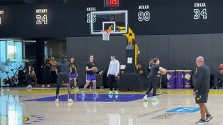 湖人全队训练结束后,詹姆斯加练罚球以及打磨中距离跳投,东契奇坐在场边观看,期间詹姆斯刚想跳投,结果被克内克特的球砸到,老詹笑着说了几句。