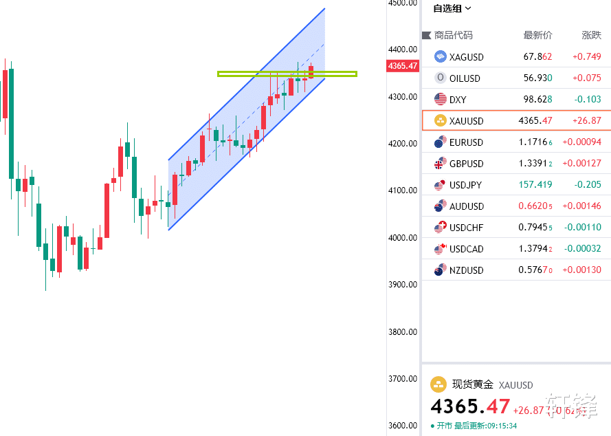 上周随着美国通胀数据落地,整体稳健下行的通胀给美联储进一步降息铺平了道路,虽然因为政府停摆,这个通胀数据的公信力稍微有些减弱,但是毕竟也是衡量市场的重要指标,同时初请失业金人数稳步下降,说明就业市场也具备韧性,叠加白银的强势带动,以及地缘政治的不确定性,经过市场发酵消化,黄金也是再度迎来强势上涨,虽然目前还未跟白银一样刷新历史记录,但是也仅仅一步之遥了,技术面上看上周黄金走势焦灼,连续在高位报收十字星,最终选择向上突破,上周四冲高4374一线之后快速回落回踩在4308附近形成日线双底并且拉出十字星,周五晚间冲高4356附近也是迅速回踩4335附近支撑,然后早间开盘直接拉高目前最高触及4372一线,距离前高一步之遥,历史高点4381也是只差一哆嗦,整体偏强格局运行,但是需要谨慎本周圣诞节,不排除有高位的获利回吐走势,所以不盲目追涨即可,日内重点关注4335周五晚间冲高回踩的低点支撑。