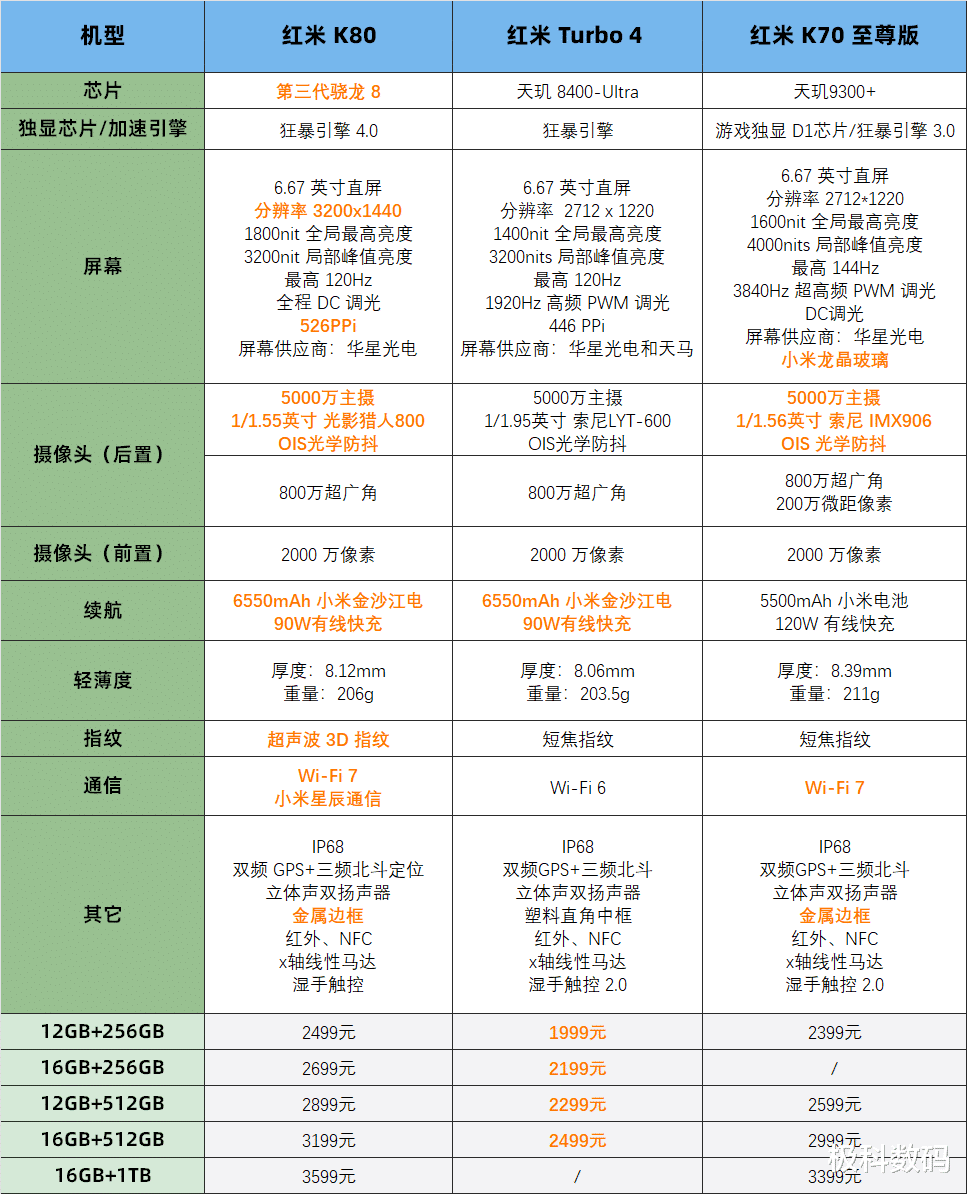 搭载天玑8400-Ultra中端芯片,但红米Turbo 4并没有人们想象中便宜,所以不少人把目光投向了芯片更为优秀的红米K80与红米K70至尊版。对比红米K80与红米K70至尊版,红米Turbo4还有优势吗?