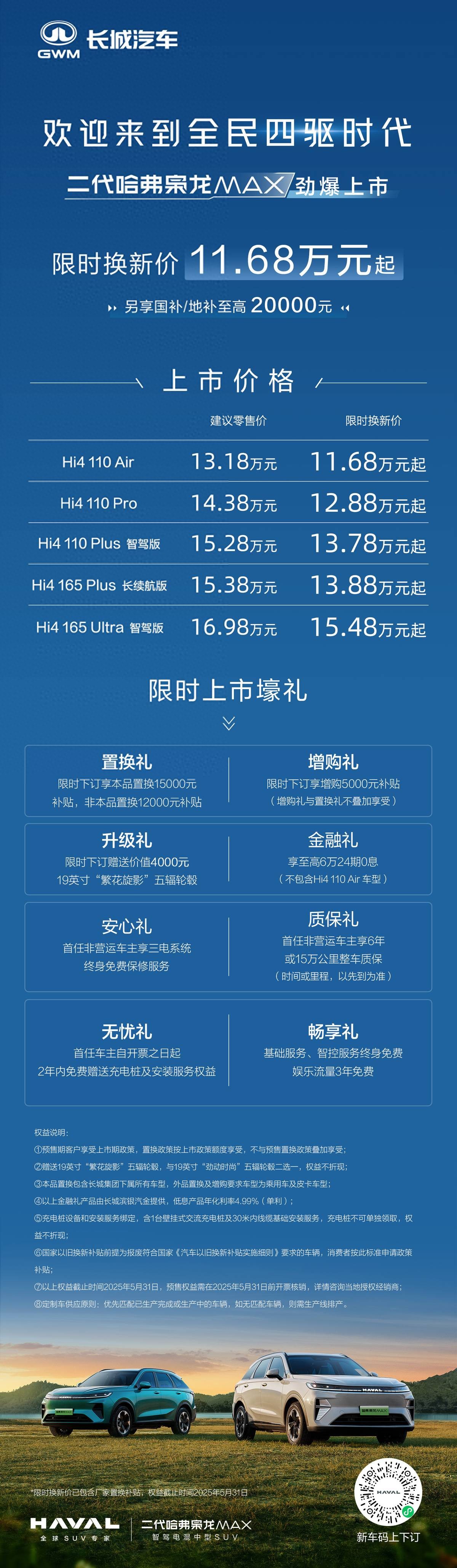 同时,二代哈弗枭龙MAX也已正式上市,官方指导价13.18-16.98万元,在5月31日前可享受限时换新价11.68万元-15.48万元,另享国补/地补至高20000元,一并公布的还有8重限时上市壕礼,包含置换礼、增购礼、升级礼、金融礼、安心礼、质保礼、无忧礼、畅享礼。