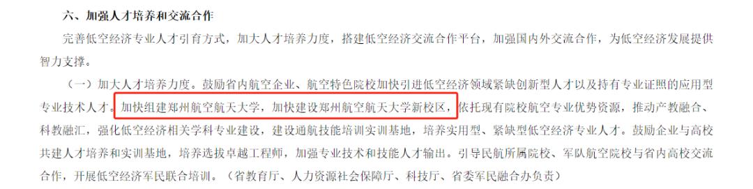 2024年8月,河南省人民政府办公厅发布关于印发促进全省低空经济高质量发展实施方案(2024—2027年)的通知。《方案》提出,加快组建郑州航空航天大学,加快建设郑州航空航天大学新校区。