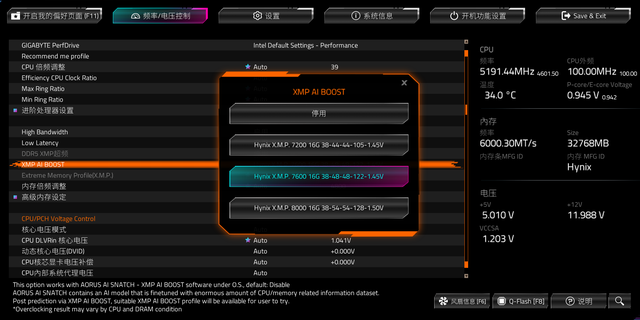 随后我们再次进入 BIOS,找到XMP AI BOOST修改成预期的内存频率就可以了,本次我们利用汉存的玄铠6000 C28系列内存实测数据显示一键超频到8000MHz频率运行也是十分轻松的事情。