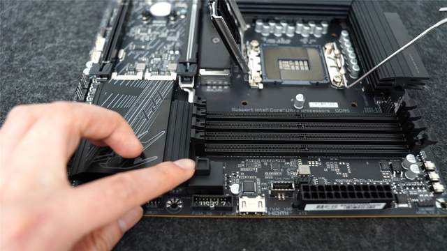 散热方面技嘉B860M更是诚意十足,其供电部分、M.2硬盘位以及芯片组上都覆盖了大面积散热装甲,从而全面的保证了散热和主机高负载工作状态下的稳定性,另外还有个十分细节的点在于这款技嘉电竞雕B860M主板上还给我们准备了非常贴心的各种快拆设计,换个硬盘啥的压根都不要螺丝刀拆开散热装甲啥的。