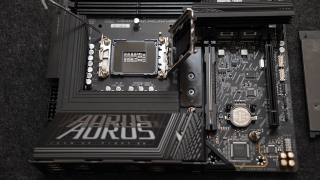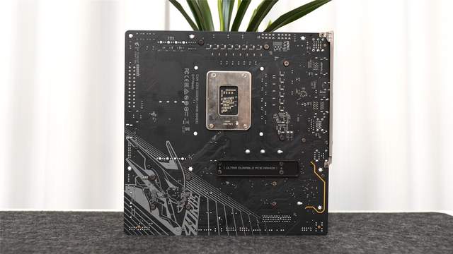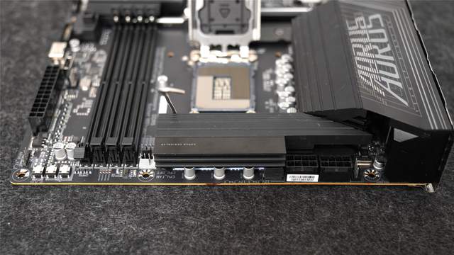显卡背部一眼看去,除了隐约可见的AORUS LOGO之外,剩下的就是非常密集各种焊脚了,而且CPU区域我们甚至可以看到技嘉也是做了单独的优化加固设计,主要是预防因为水冷或者风冷散热器自重过大给主板以及CPU带来切向压力而可能影响散热。