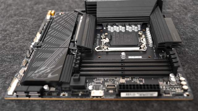 拿出产品可以看到咱这技嘉主板电竞雕的风格拉满,黑色为主基调设计确实质感不错,而且最值得点赞的就是这款主板的供电设计以及散热了,12+1+2相供电直接保证了其对于不同性能段CPU的全面兼容,甚至技嘉这款主板也给我们留了两个8Pin CPU电源接口,后期空间充足。