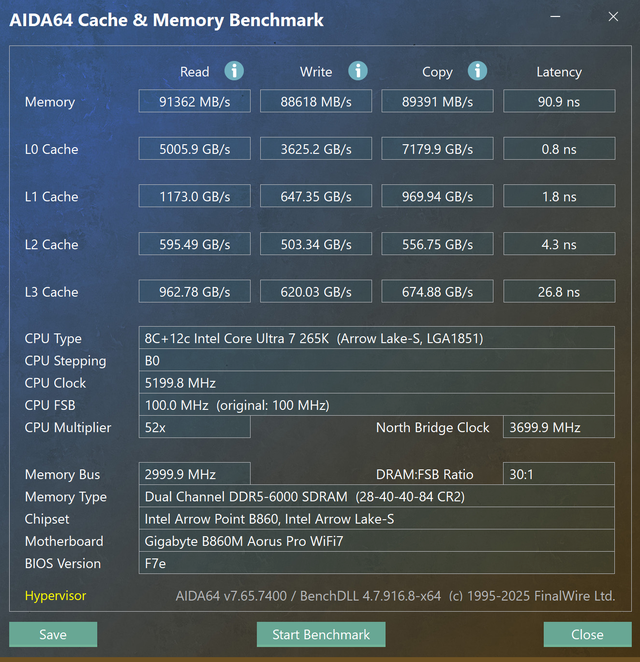 进入技嘉BIOS主板进行一键XMP之后就到了6000MHz频率状态,AIDA64 显示的内存时序为 28-40-40-84 CR2,此时: