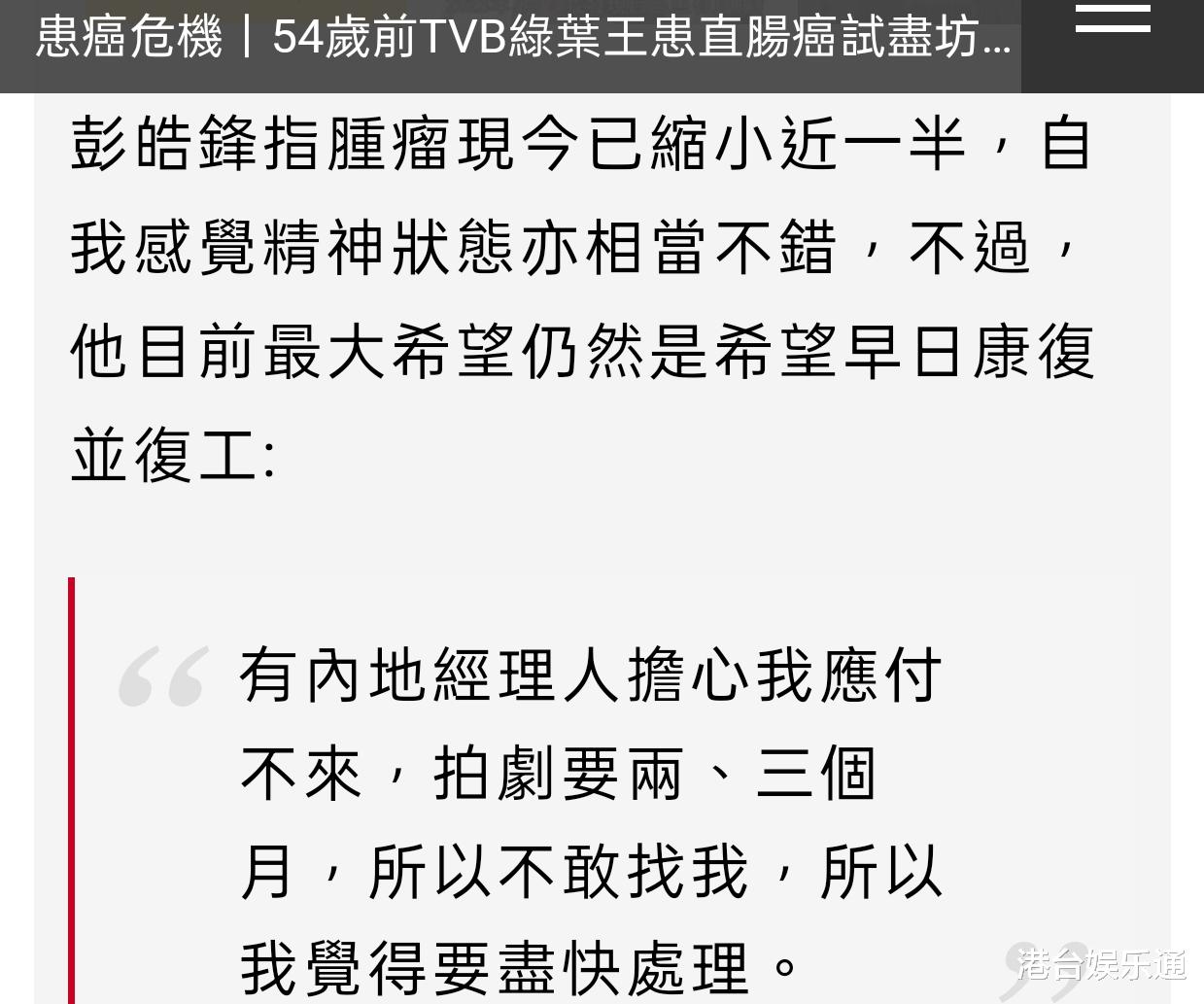 彭皓锋告诉港媒,已计划于近期内进行手术,但手术费用可能高达30万港元,他希望可以复工拍戏尽快赚到相应金额,等完成手术后再努力让生活回到正轨。下图为港媒报道截图: