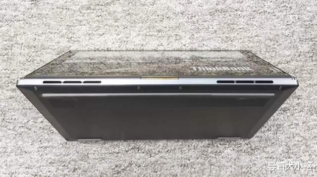 翻转机身到底部,TwistGen4的设计则与传统笔记本电脑一样。底壳是完整的结构件,金属材质,中间水平,边缘20mm的地方做了一圈下沉,分别圈出了固定点。底壳中间靠上位置是机器的进气孔,圆形小口阵列,密密麻麻,看不到内部的元器件。往下的位置是左右对称的两个扬声器开口,尺寸不大,功率高亢,外放声音洪亮,播放音乐、视频清晰流畅。