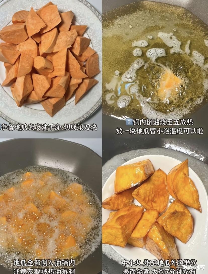 炸地瓜是关键的一步。锅里倒油,油量要能没过地瓜块。油温烧至五成热,怎么判断?可以放一小块地瓜进去,如果周围冒出细密的小泡泡,说明温度刚好。这时候把地瓜块全部倒入,中小火慢炸,大约7分钟左右。期间要用筷子轻轻翻动,让地瓜受热均匀。炸到地瓜表面金黄,外皮微微变硬,用筷子能轻松扎透,说明已经熟了。捞出沥干油,先放在一边备用。